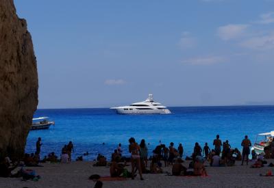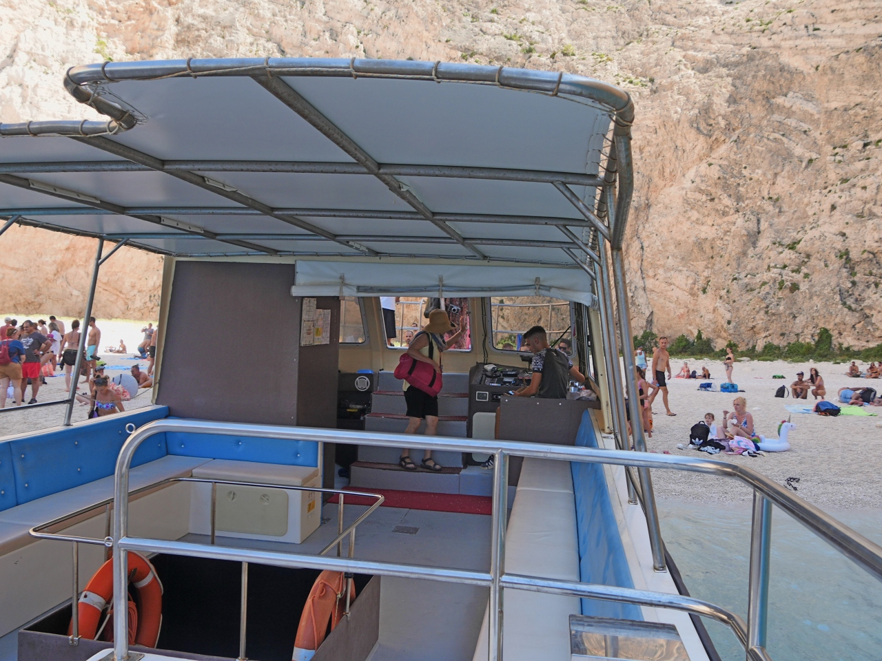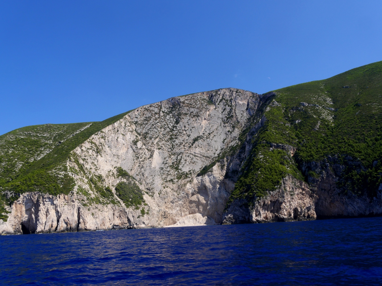 スキナリ岬から少し大型の船で有名なShipwreck Beachへ向かう.約30分の行程だ.結構の高速船 15km ほどの道のりだ スキナリ岬の桟橋を出発.青い海と茶色い断崖が美しい ケファロニア島がよく見える