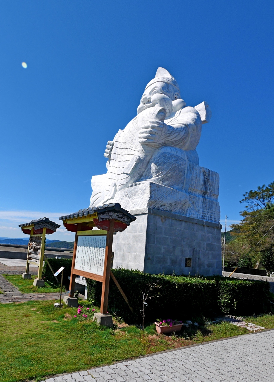倉岳大えびすがある.,そのほほえましい像を見て,ドライブの疲れがとれる.説明は「えびす像の高さが7mあり、重さは320トン 恵比寿様は七福神の一つで、鯛釣りが盛んな倉岳町では、昔からえびす様を豊漁や航海の安全の神様として祀られてきました。今では大物のタイを抱え、天草の海を見守りながら、全国から集まる釣り人たちにやさしくほほ笑みかけています。https://www.9navi.jp/ebisu-park.html」平成2年作 台湾花蓮産大理石