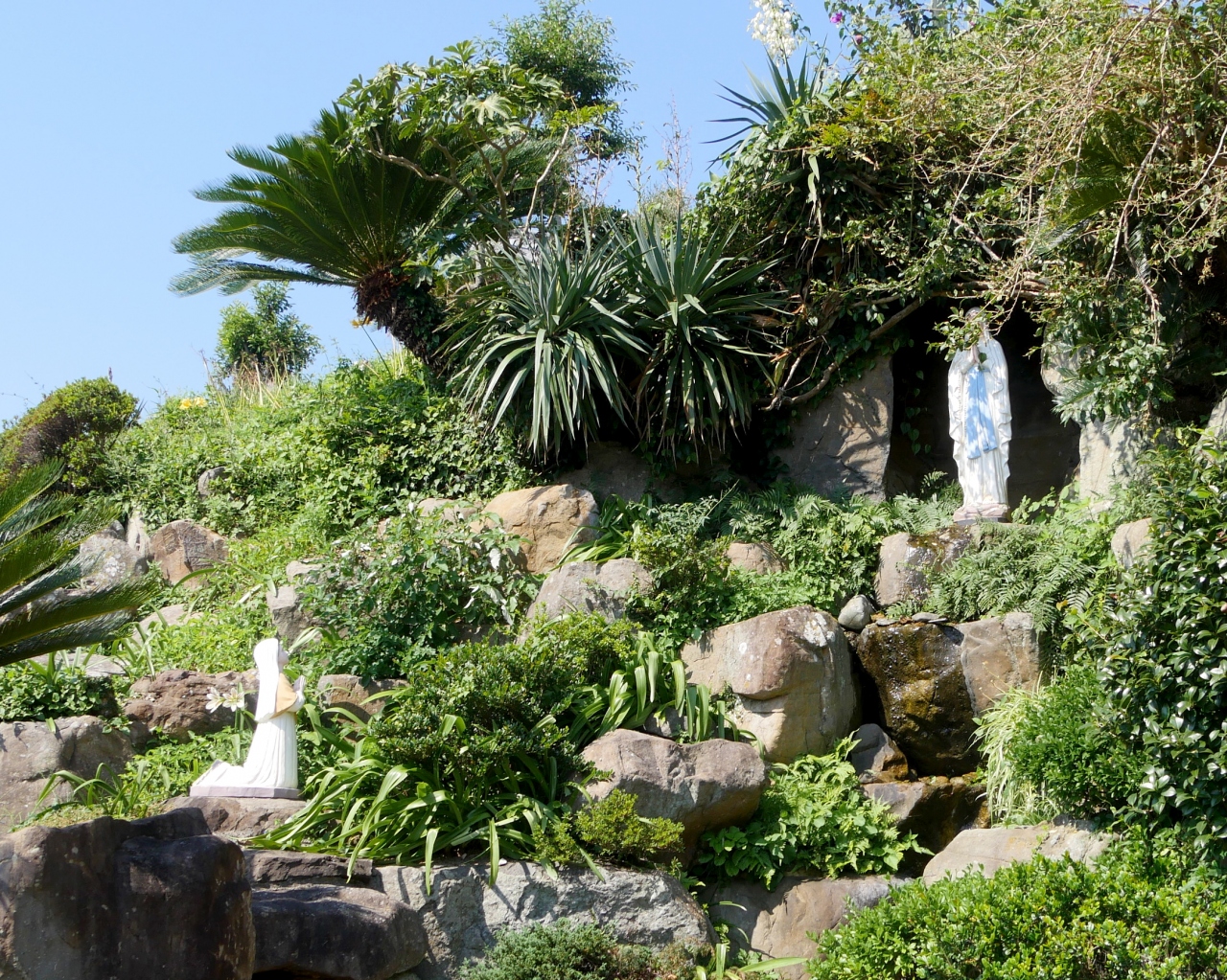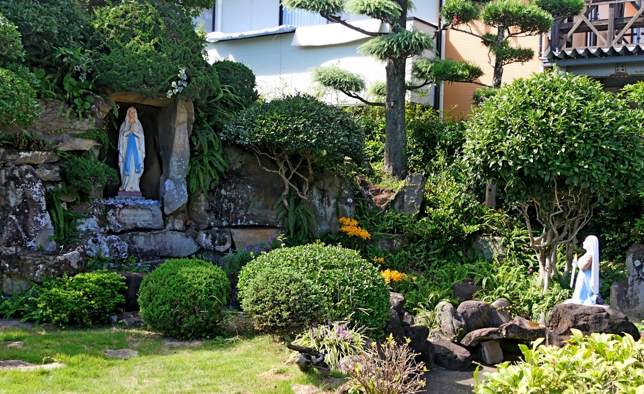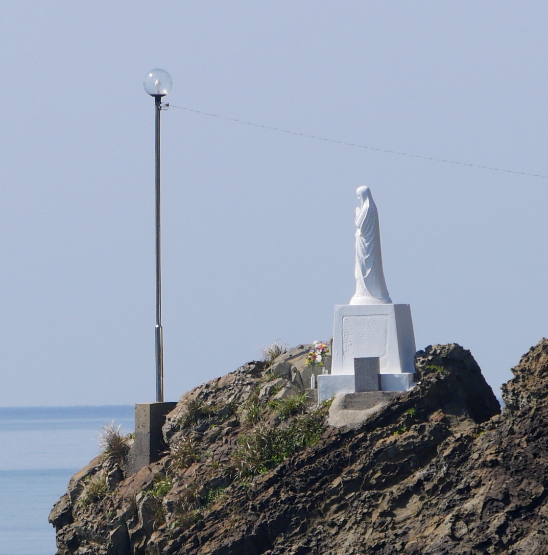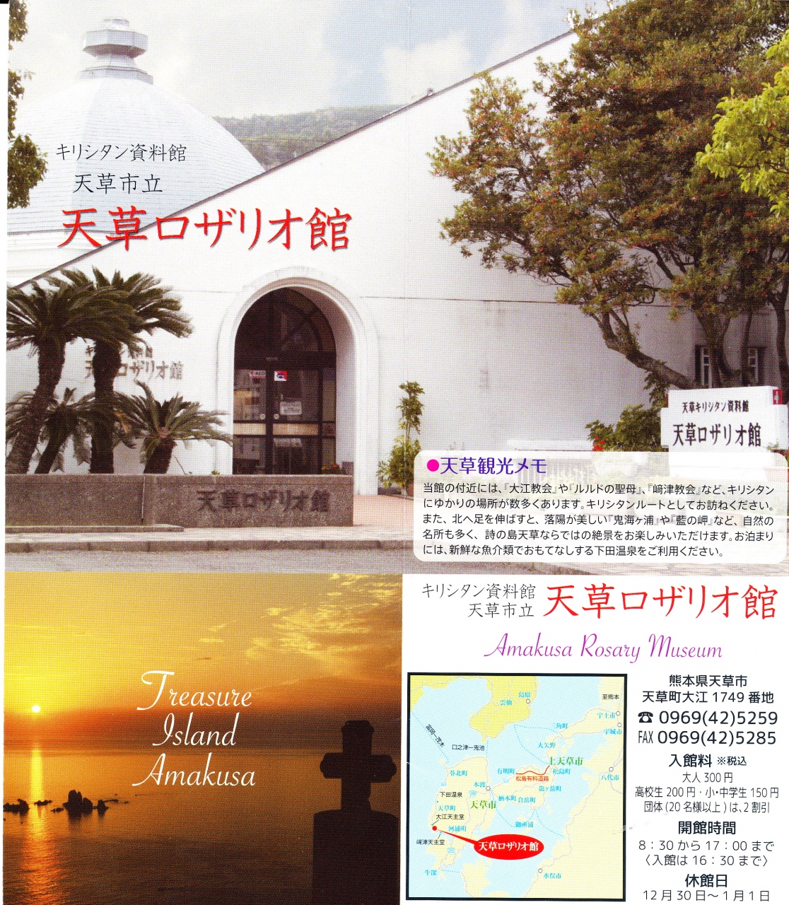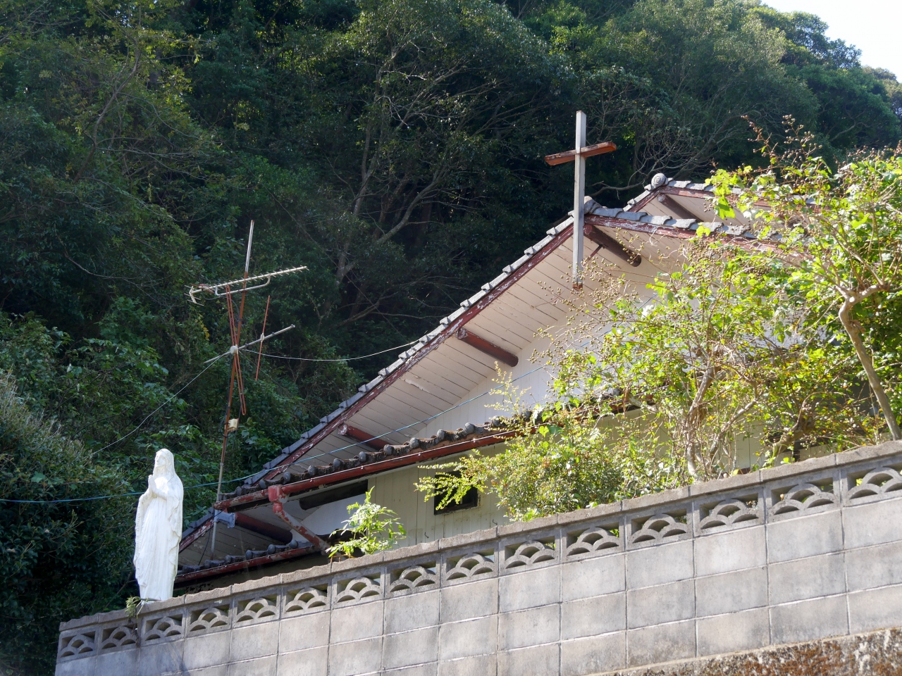 崎津集落ガイダンスセンターに,今回の旅行のメインの目的は崎津教会に来ることだった.あの鉄川与助のたてた教会 私は上五島の冷水教会や青砂ヶ浦天主堂,江上天主堂などが好きだ.しかしここの教会もゴシックの中に和の様式があってすばらしい.中は畳,ステンドグラスやこうもり天井が日本風だ 修道院として使われていた建物と諏訪神社が隣り合わせであることもおもしろい 海上のマリア像もなかなかだね