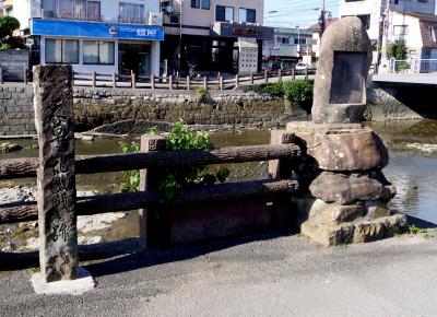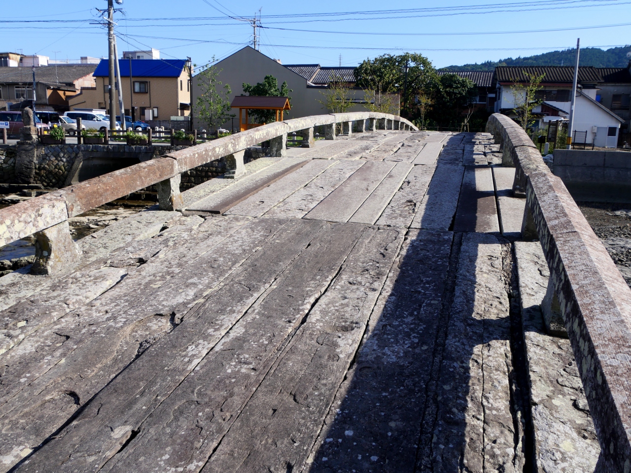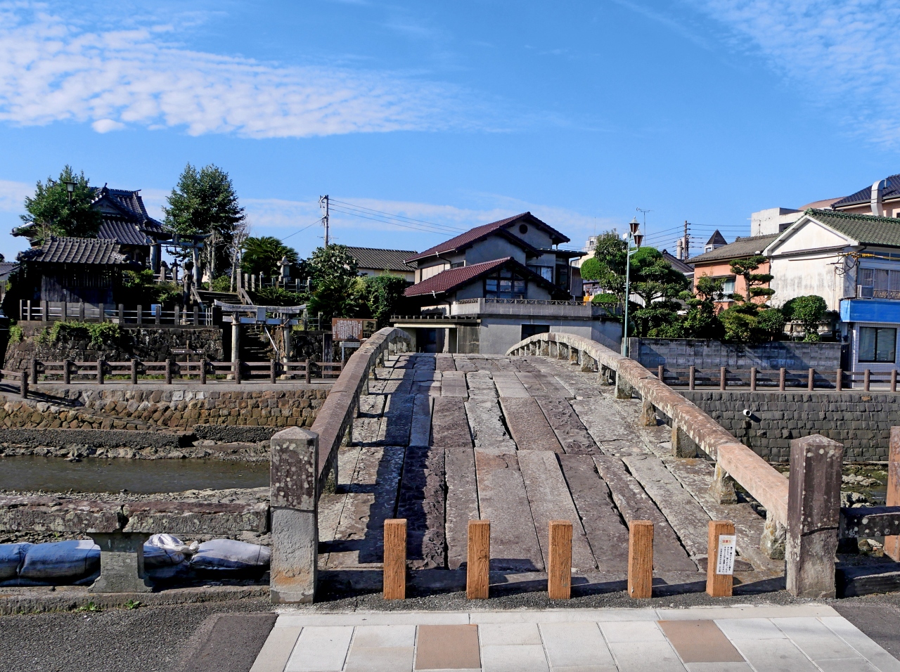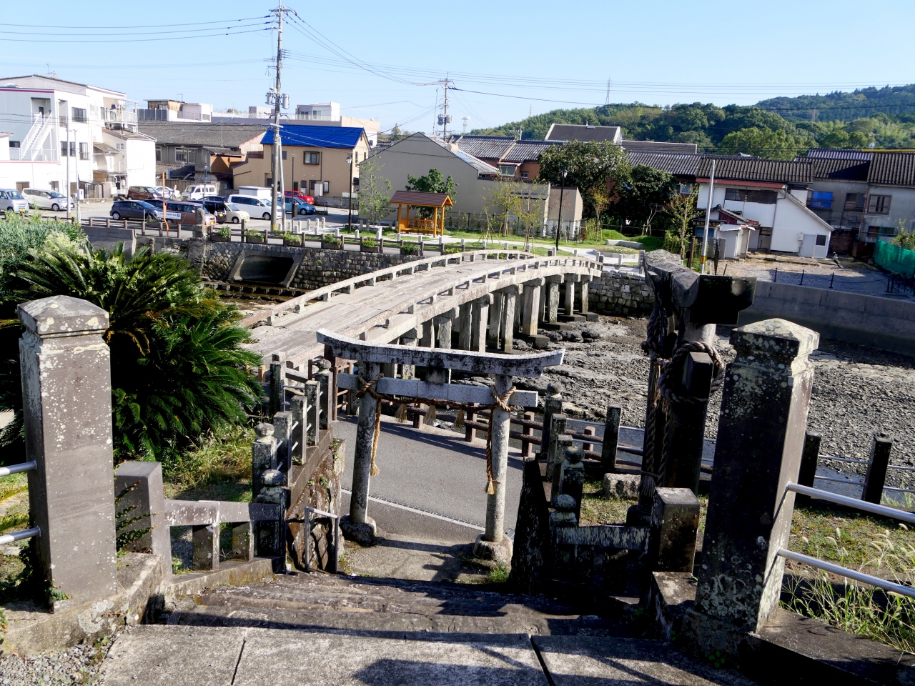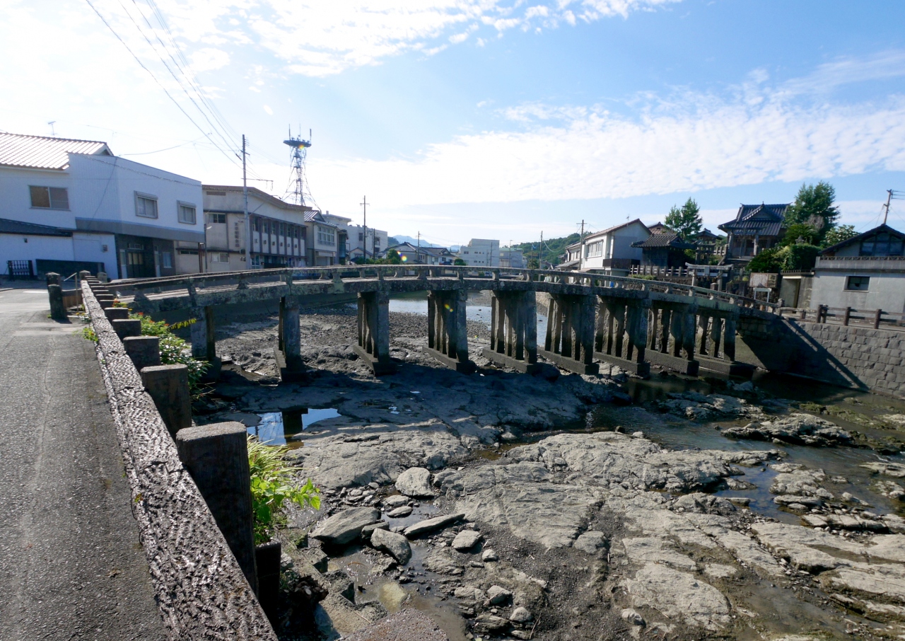 実際にわたることができる19世紀の石橋それも多脚式だ.そばの八坂神社祇園社との組み合わせのたたずまいがいい.裏には16世紀の尾越の板碑もある.キリシタン殉教碑があるが,歴史的にはこの場所での殉教はなかったようだ.本渡にきたらここを見ないのはずいぶん損だと思う.説明には「『国の重要文化財』に指定されている。柱状の石を組み合わせた素朴なつくりで、橋脚は水切りのための三角形の流線型になっている。長さ28.6m、幅3.3m近くもある橋間に、約30㎝の角柱が5列9行45脚によって支えられている。