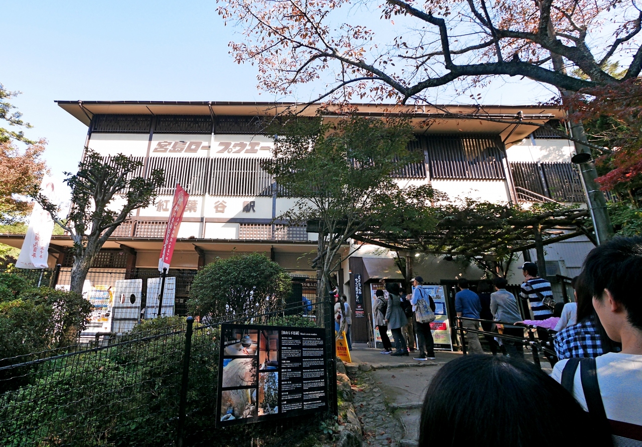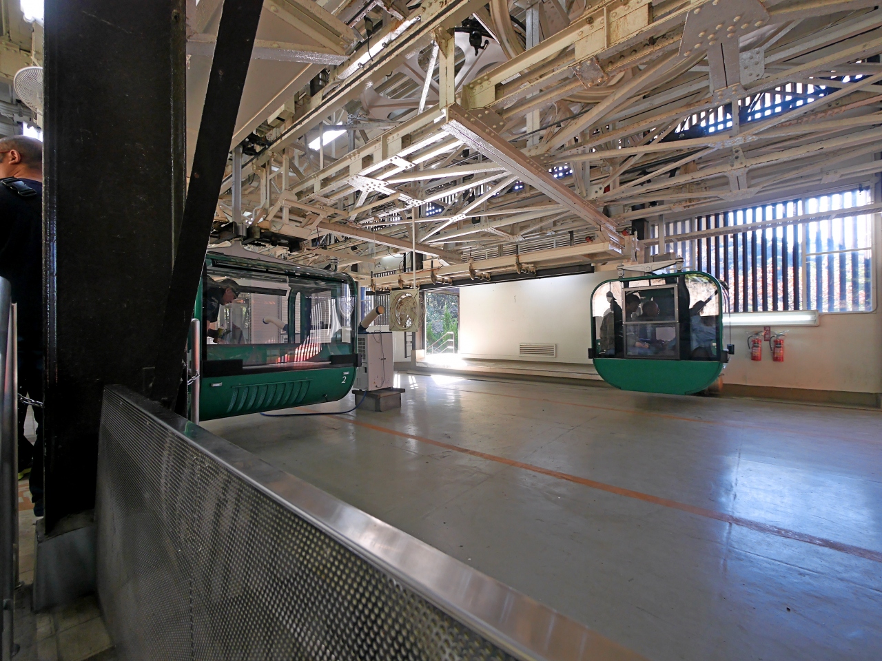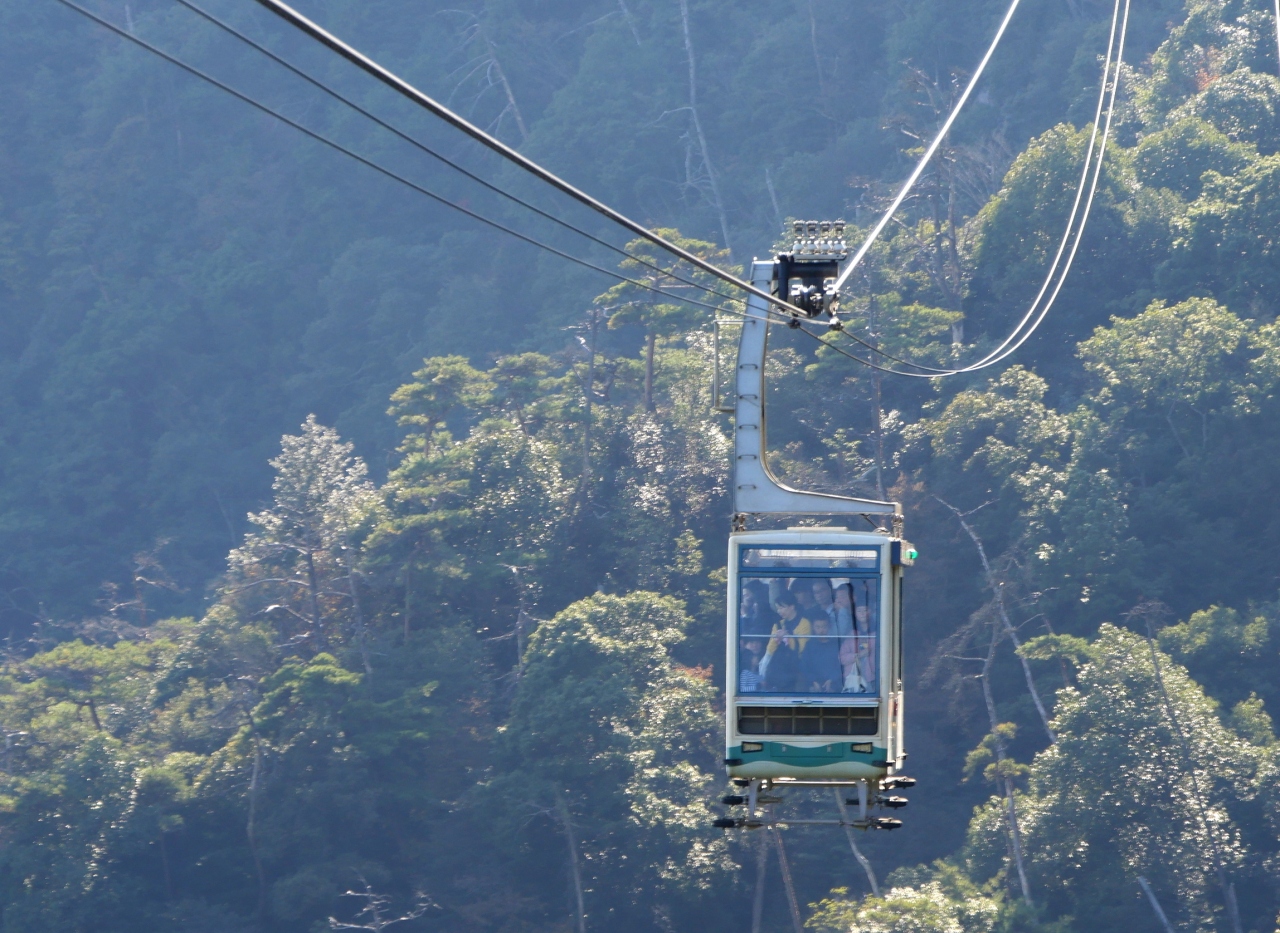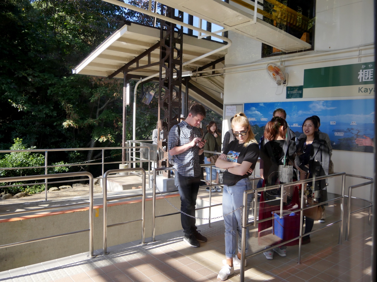 このロープウエィ 最初が循環式 榧谷駅で 交走式に乗り換える 循環式は1分おきに8人乗車 スキー場などによくあるもの 8人乗りというが,旧日本人サイズ.大柄の欧米人だと6人でもきゅうきゅう.紅葉のシーズンなどの休日は非常に込んで並ぶが,目安は階段の下で40分あまりだ.小さいが確実に運んでいくので,思ったより待つ時間が少ない