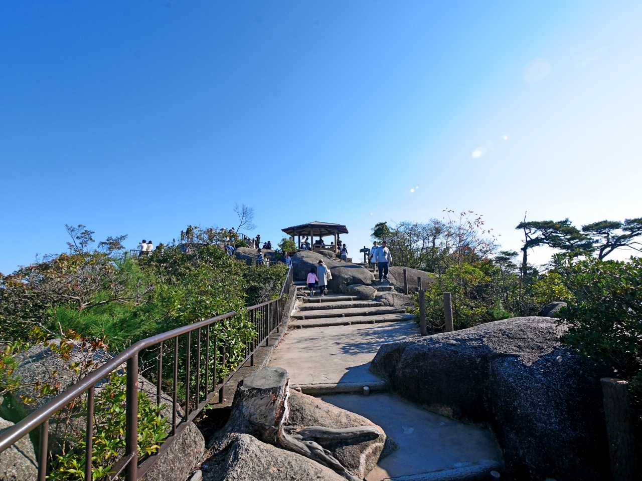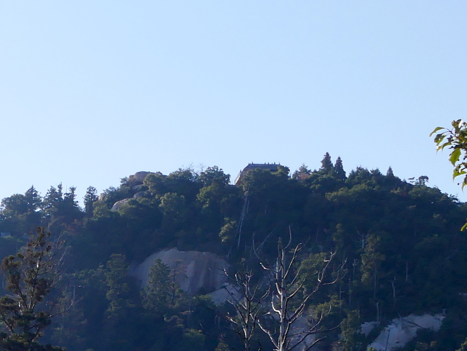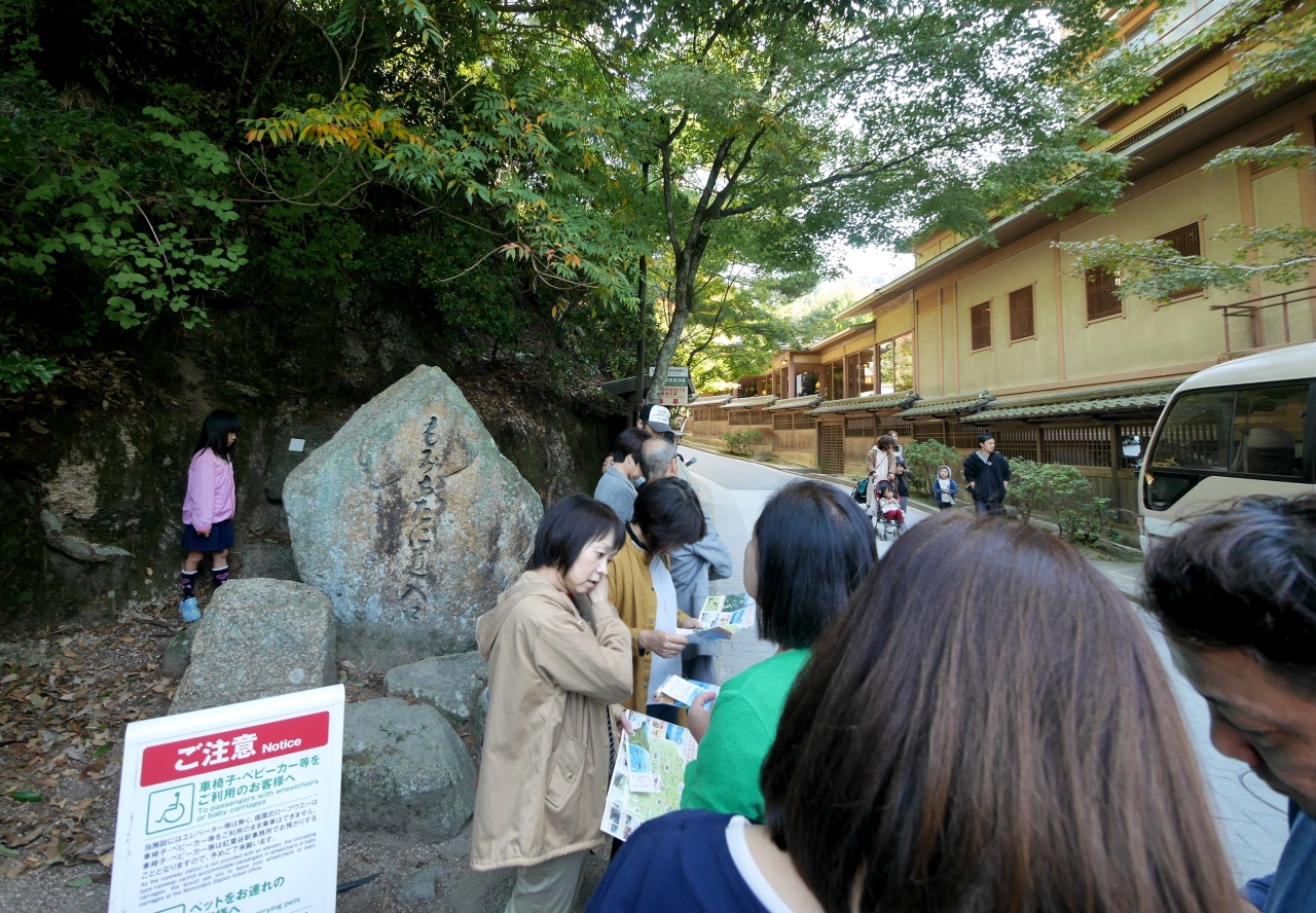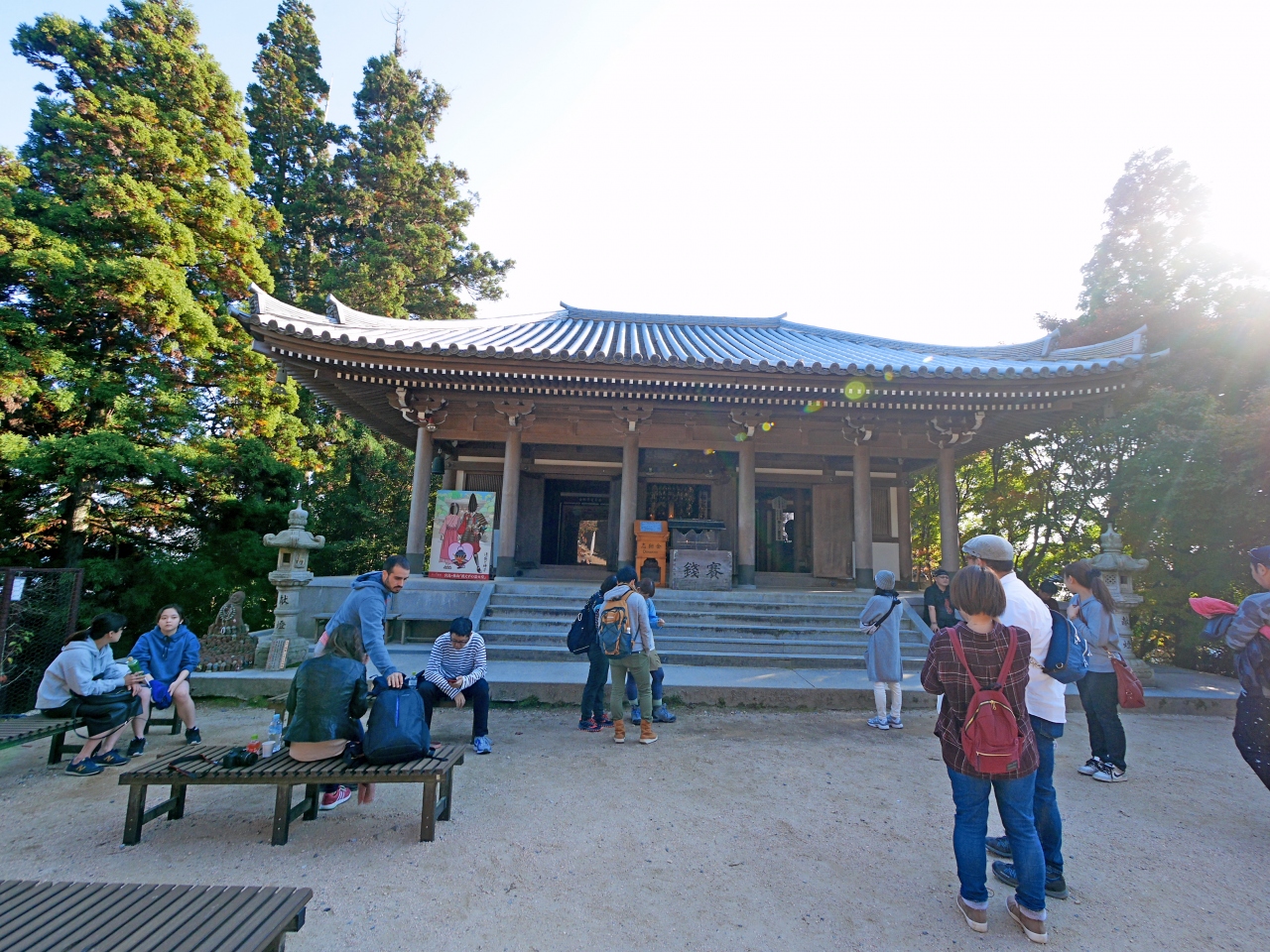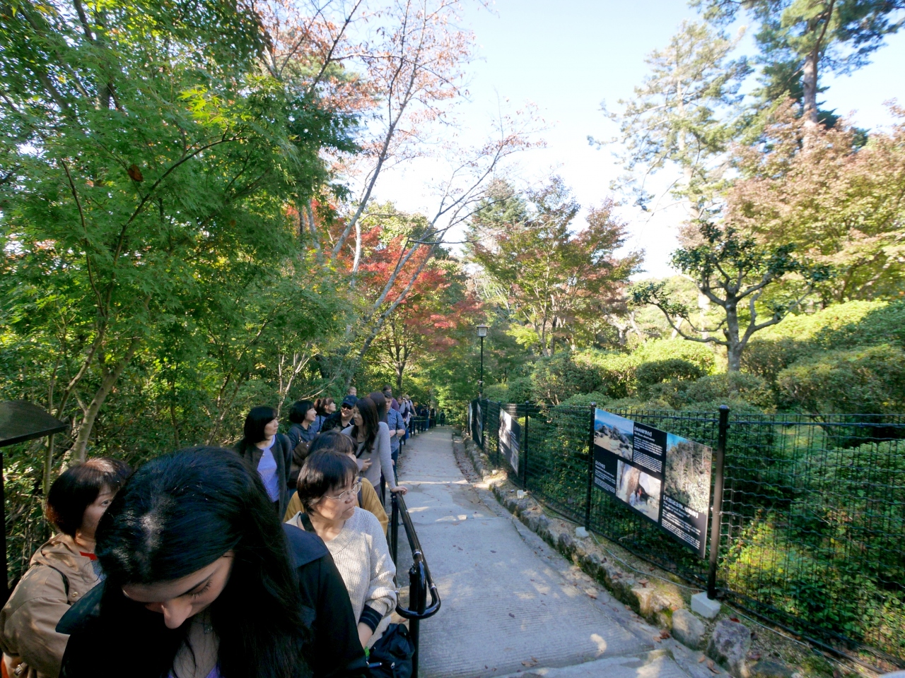 このロープウエィ 最初が循環式 榧谷駅で 交走式に乗り換える 循環式は1分おきに8人乗車 スキー場などによくあるもの 8人乗りというが,旧日本人サイズ.大柄の欧米人だと6人でもきゅうきゅう.紅葉のシーズンなどの休日は非常に込んで並ぶが,目安は階段の下で40分あまりだ.小さいが確実に運んでいくので,思ったより待つ時間が少ない