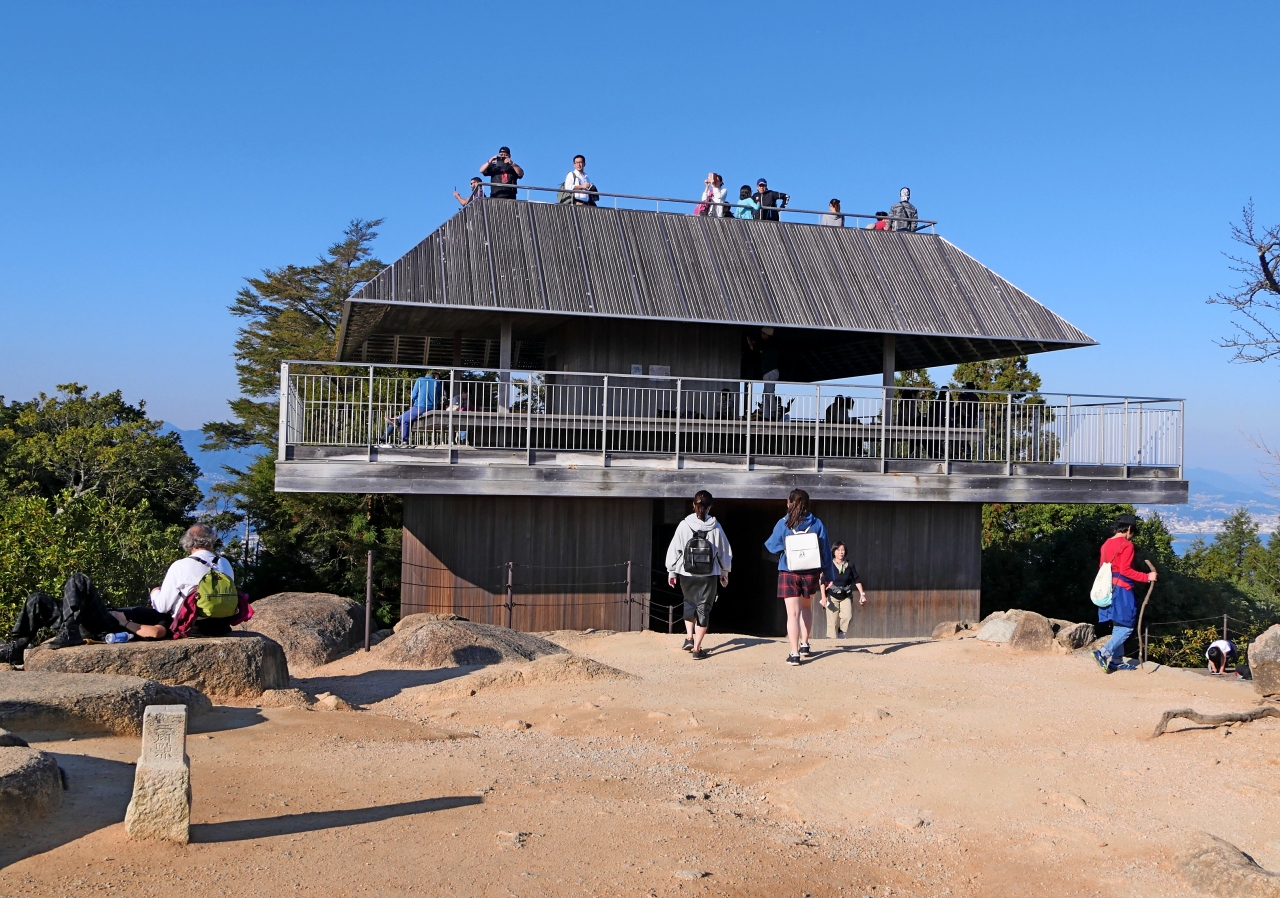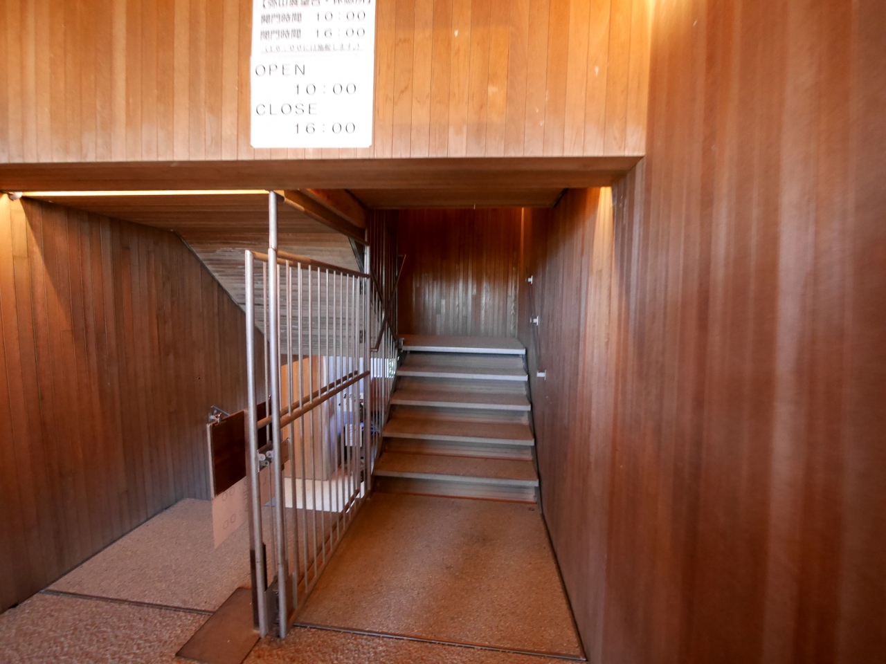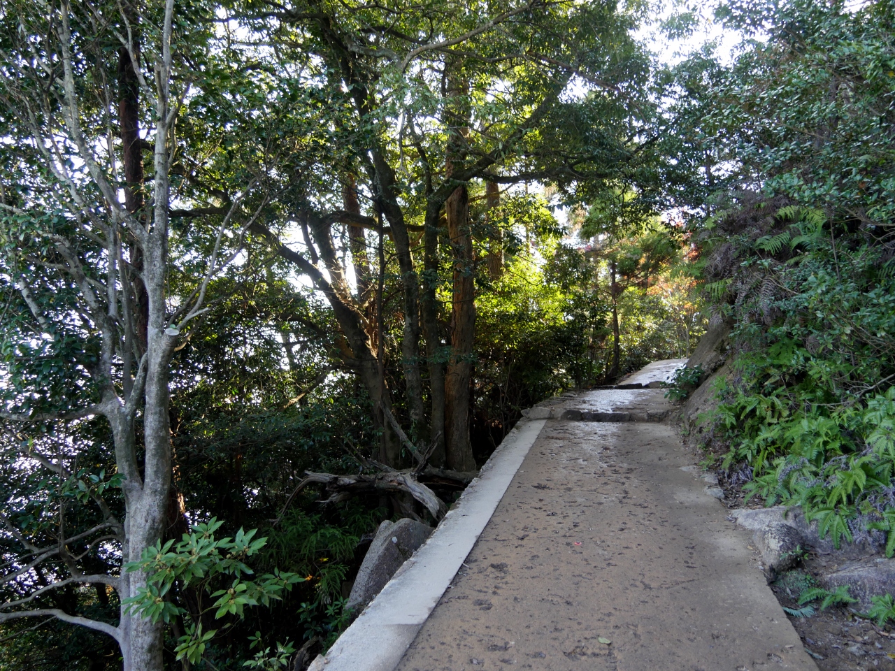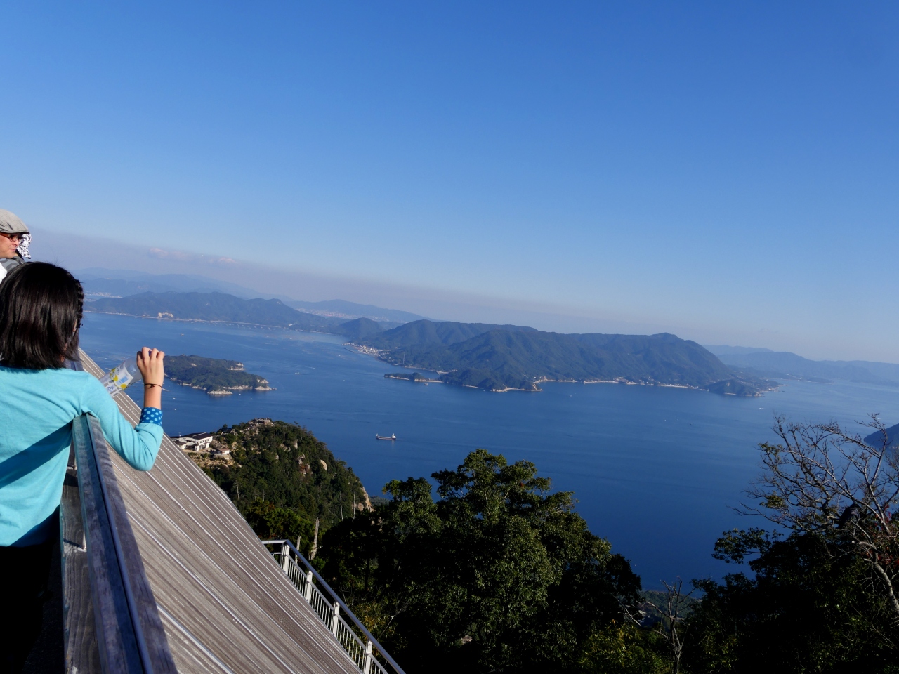 このロープウエィ 最初が循環式 榧谷駅で 交走式に乗り換える 循環式は1分おきに8人乗車 スキー場などによくあるもの 8人乗りというが,旧日本人サイズ.大柄の欧米人だと6人でもきゅうきゅう.紅葉のシーズンなどの休日は非常に込んで並ぶが,目安は階段の下で40分あまりだ.小さいが確実に運んでいくので,思ったより待つ時間が少ない