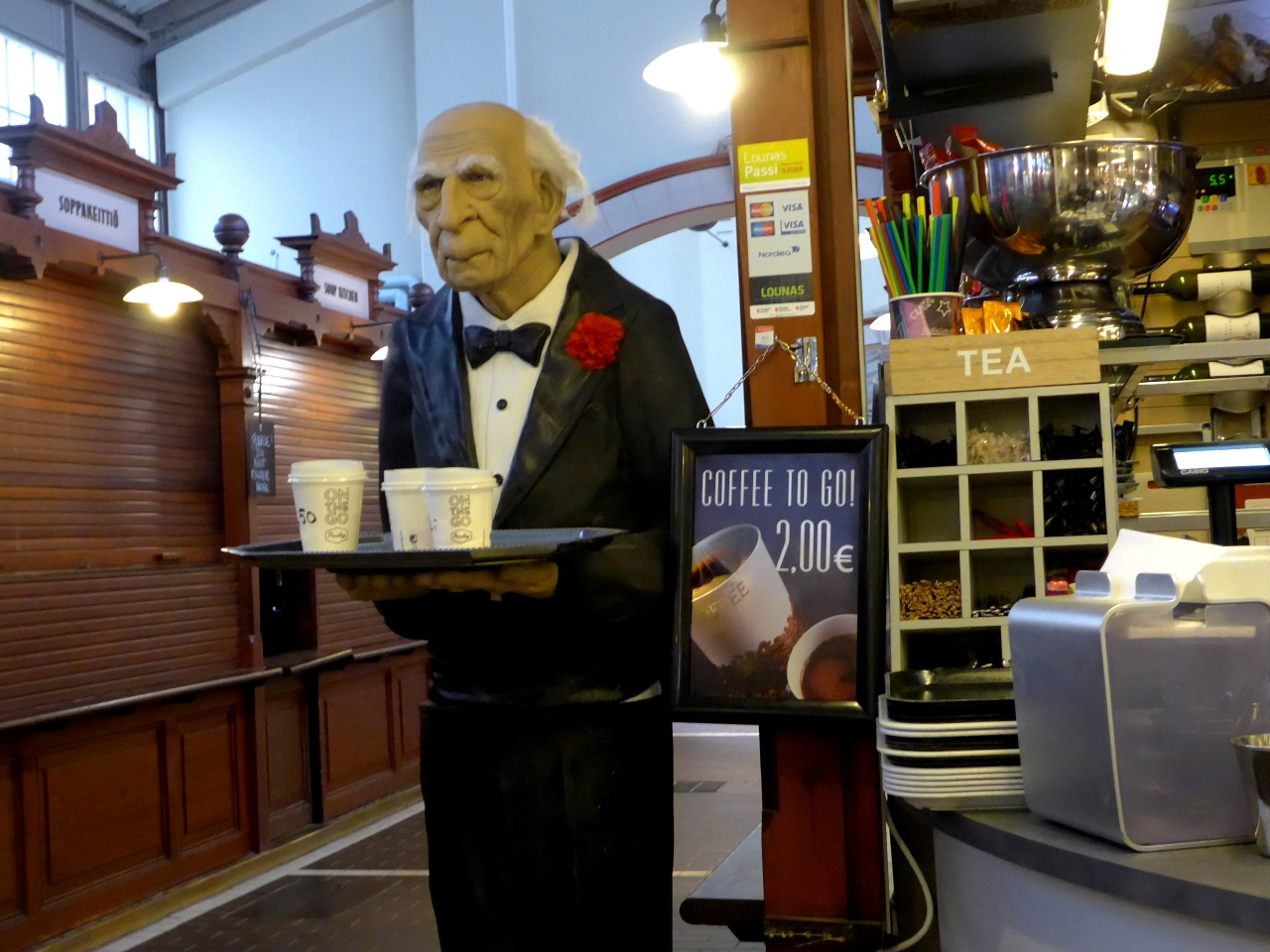 KauppatoriのVanhakauppahalli(オールドマーケット)は面白いカフェやお土産屋も多いが,このScandinavia Cafeの人形は目立つ 思わず記念写真 スタッフも一緒に入ってくれた カレリアパイもサンピラ(フィンランド風のサンドイッチ)もわりとおいしかった.なおスープキッチン(Suppakeittio)のシーフードスープもおいしいが,2016年10月に10ユーロだったのが10.4ユーロに値上がりしていた.