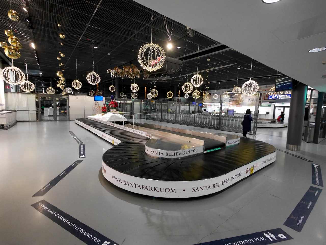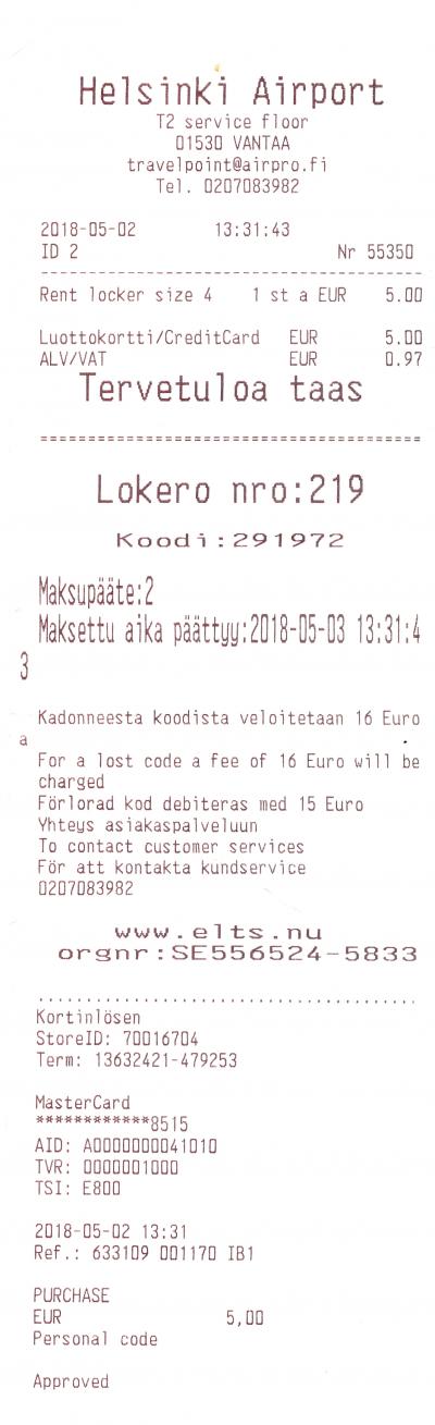 コインローカーはターミナル2(フィンエアのターミナル)の地下にある.写真は撮らなかったが,新式のロッカーでボタン操作とクレジットカードですむ.コードナンバーで開けることになるので,この紙をなくせない 3人分手荷物を入れる.中型で1個5ユーロ これは使える!