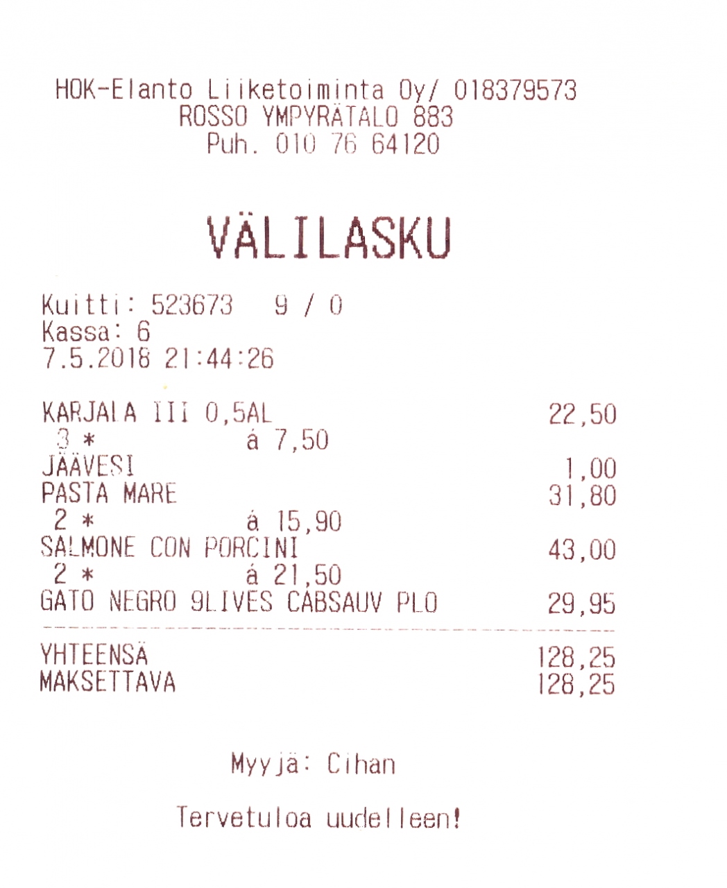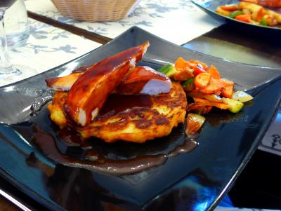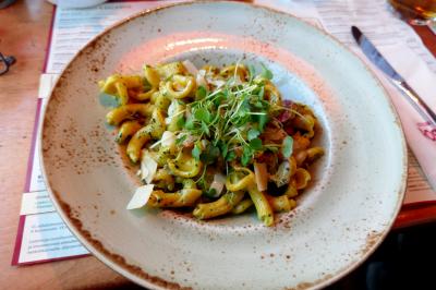 夕食をイタリアレストランRossoで食べる.まあ普通のレストラン ワインはLauraが選んでくれて安い割にはおいしかった ファミレスのようだがランチの時の様には安くはない Salmone con Porcini 21.5ユーロ 海のパスタ 15.9ユーロ 他にビール7.5ユーロ Gato Negroという赤ワイン 29.95ユーロ 水1ユーロ しめて128.25ユーロ ひとり32ユーロと決して安くはない 救いは赤ワインが思った以上においしかったこと!このようなファミレス風のところにしては,なかなかのワインだった
