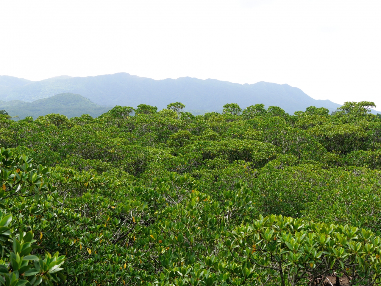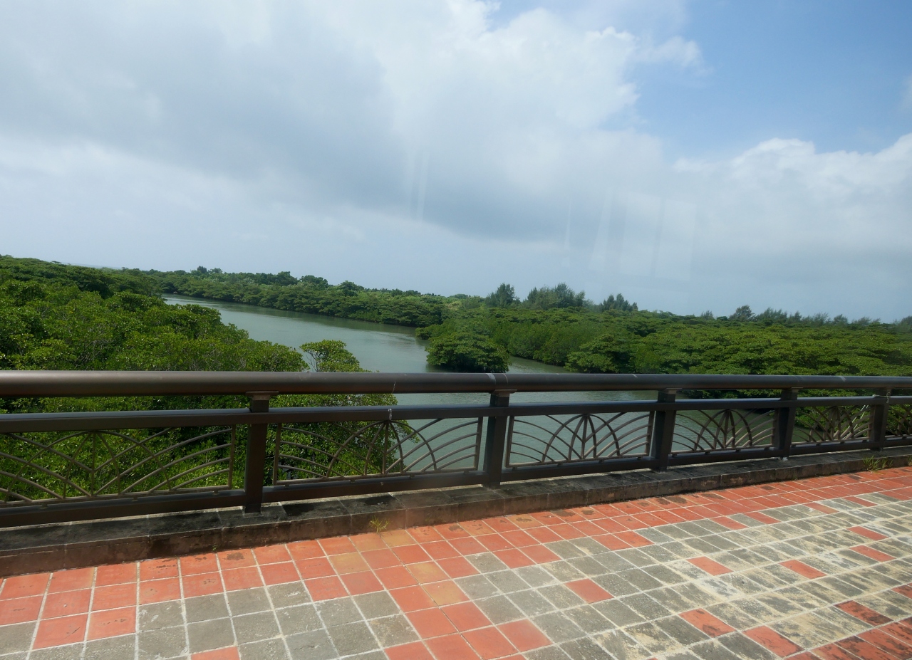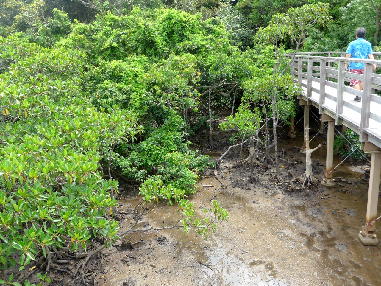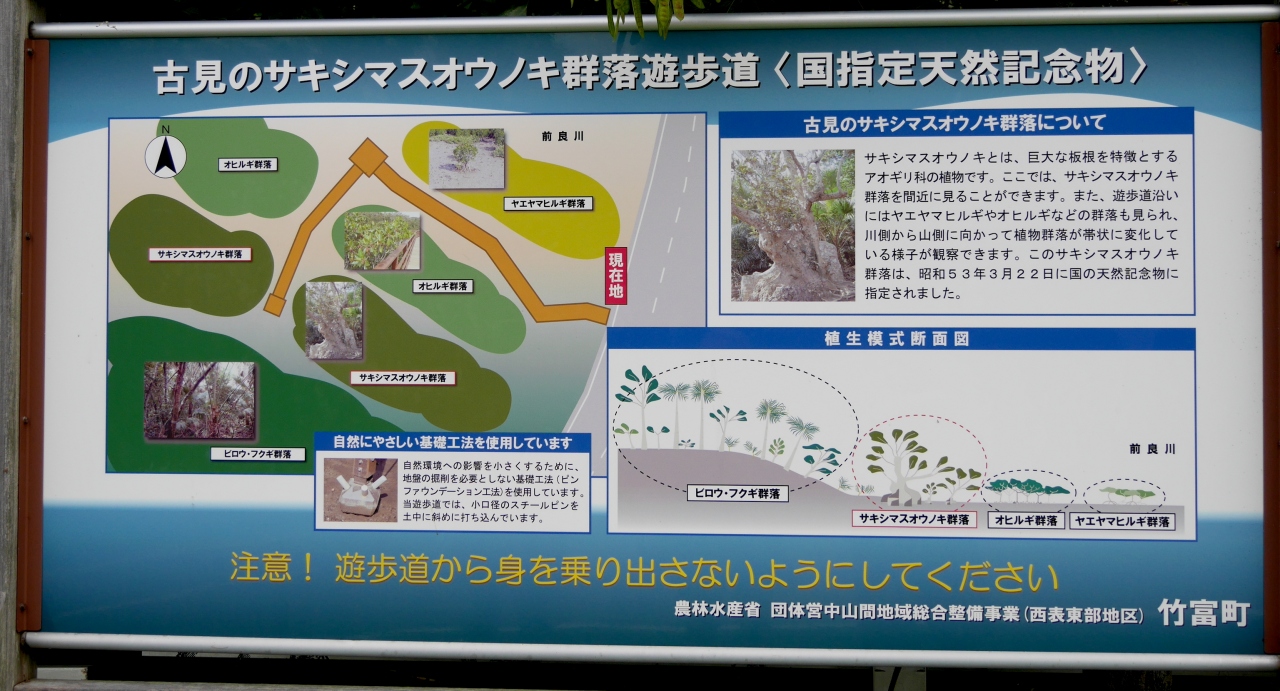 この群落 サキシマスオウノ木のみでなく,オヒルギやヤエヤマヒルギの群落もある.駐車場から徒歩1-2分の遊歩道を歩く.ヒルギ=マングローブの群落を見るにはとてもいい場所だ.サキシマスオウノキは板根を発達させる.見事だ.一見の価値あり