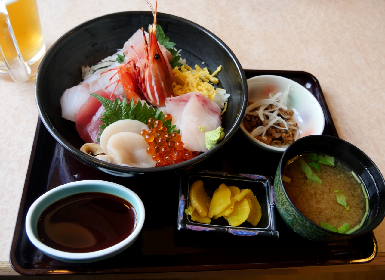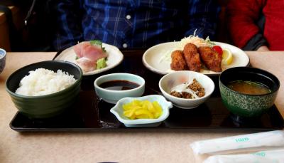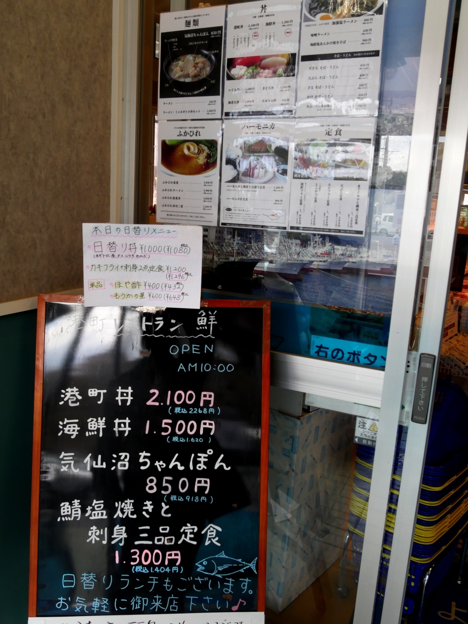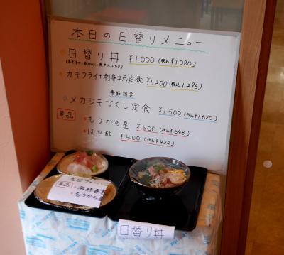 気仙沼お魚いちばでランチ.この中の港町レストラン鮮で昼食 私は港町丼2100円,海鮮丼だが魚介類がたっぷり 同伴者は海鮮丼1500円(これはお得だ!)本日の日替わりメニュー カキフライ刺身2点定食 1200円 いずれも税別 わたしだけ車を運転しないのでビール 新鮮でおいしかった!港町丼の鯛がしこしこと新鮮だった!合格!