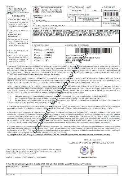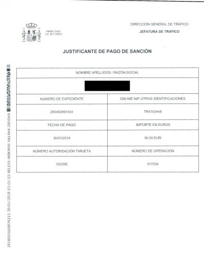 に書いてあった!本当に助かった,そうでなければもっと面倒だったとおもう.ありがたかった 罰金支払い書 http://multas.dgt.es.にアクセスすれば,英語画面があり簡単に支払えた.50ユーロをカード決済.照会料40ユーロに罰金50ユーロ 合計90ユーロだった- 旅行時期