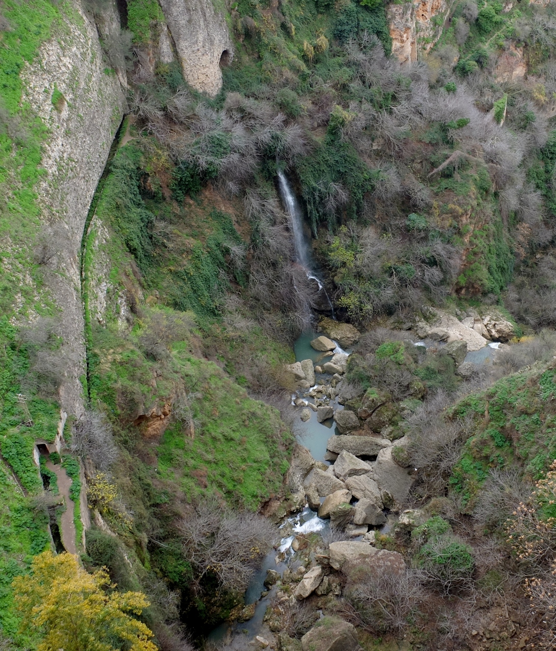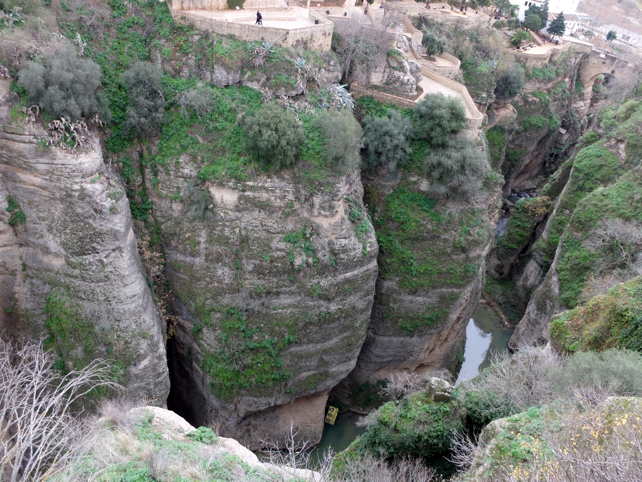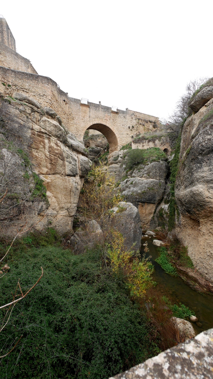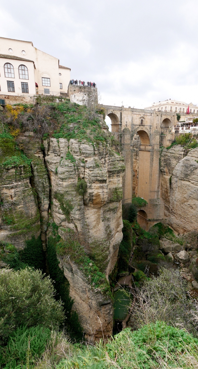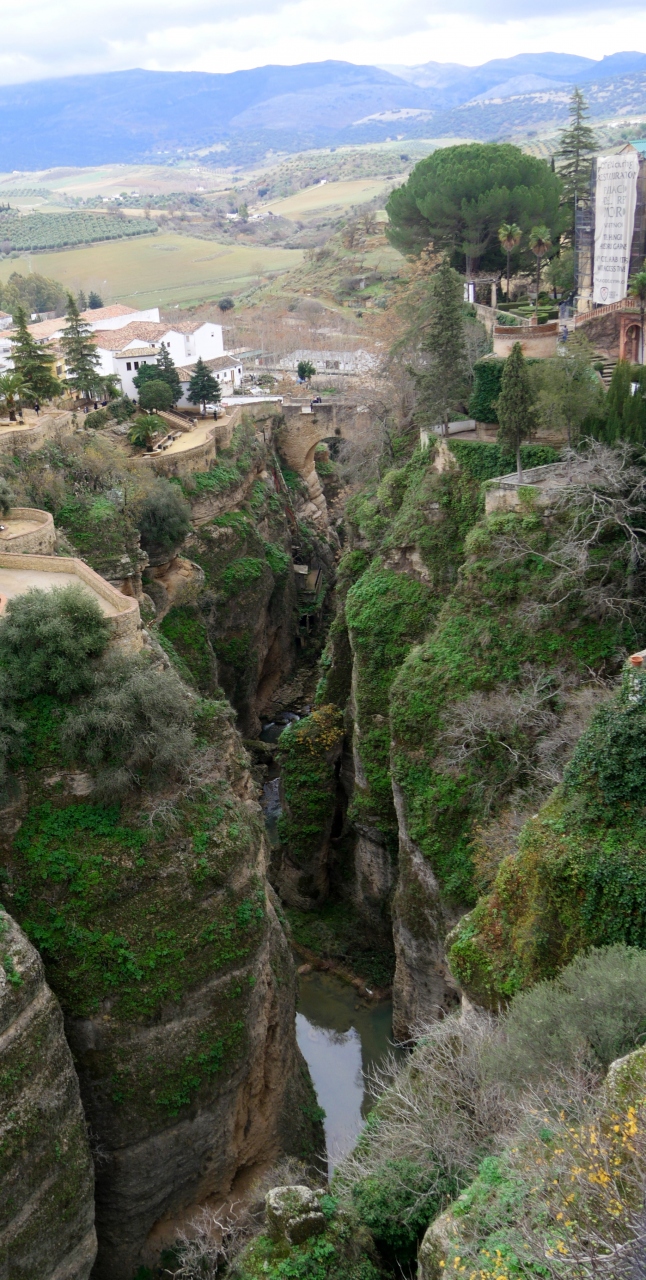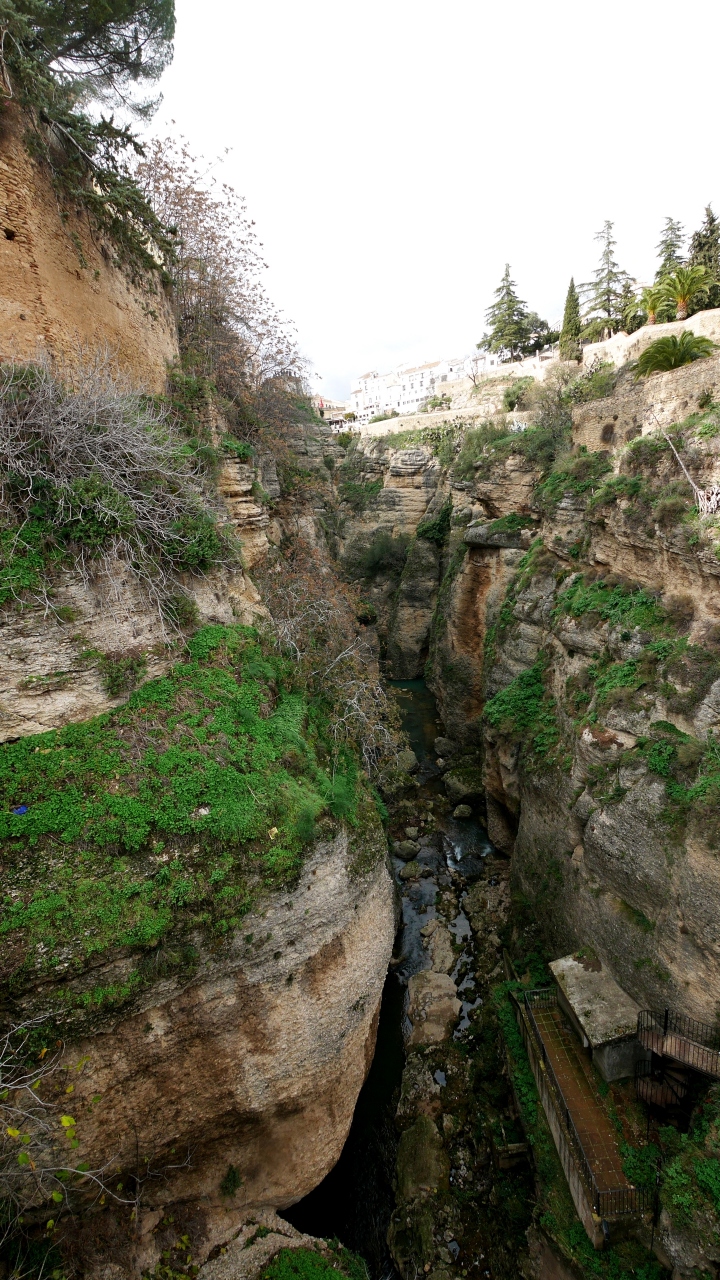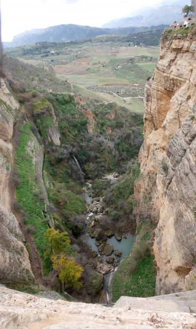 高さ100m 絶景が広がる 良くこんな橋を作ったものだ 下に流れるGuadalevin川沿いにはのどかな農村風景と滝,空中に都市があり,地上には農村というイメージ ラピュタの世界だね あとで下に降りてみて眺めるとすごい!手前(闘牛場側)のJardines De Cuencaという公園側に降りるとよい