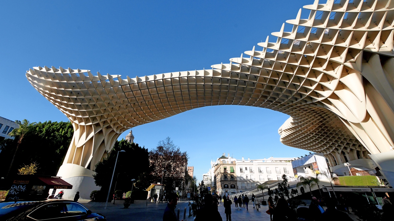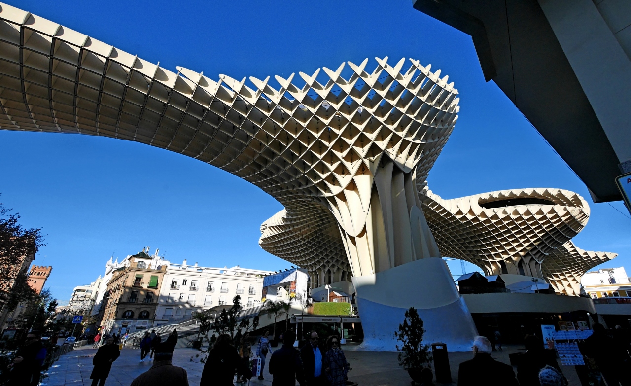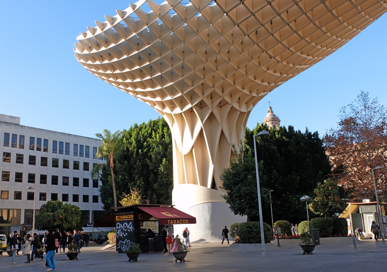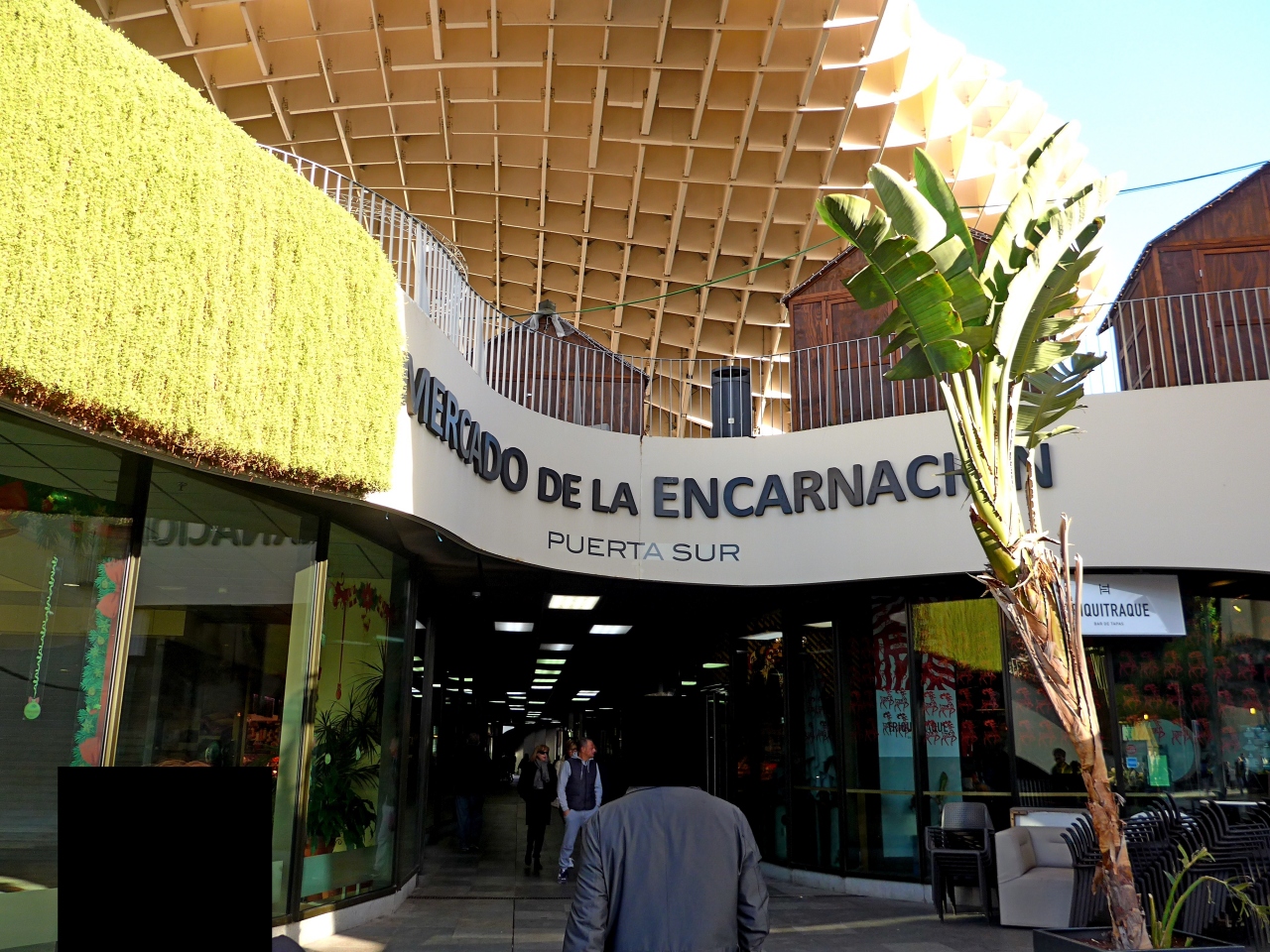 メトロポールパラソルへ 2011年にできたと なかなかおもしろい曲線美だ 白っぽいクリーム色が青い空に映える 1階には市場がある 整然とした市場なので少し面白みに欠けるがそえでも生活がわかるような花屋,八百屋,肉屋などがある.ここまで来たら少し寄っても良い