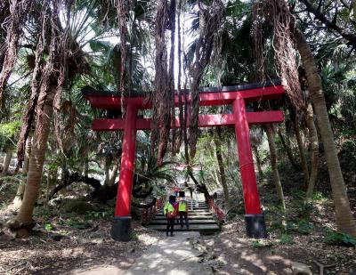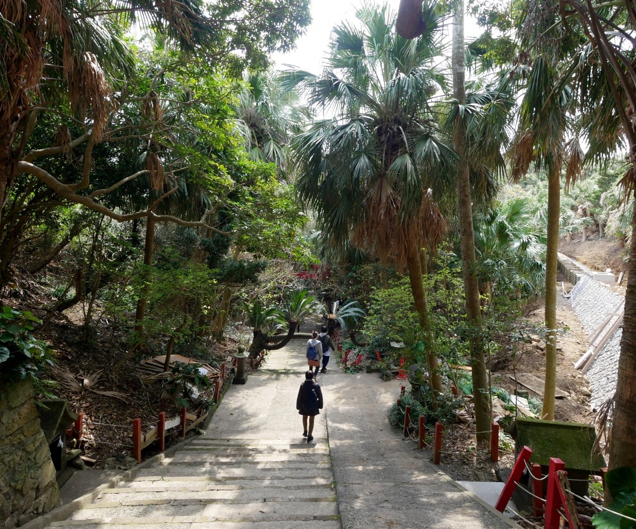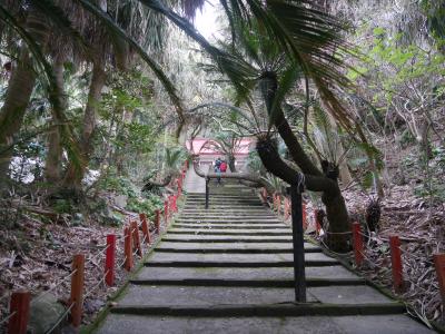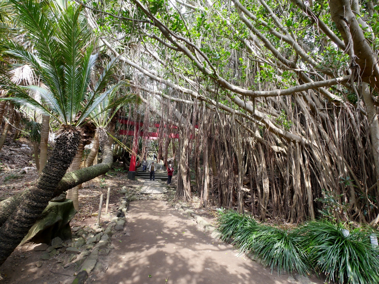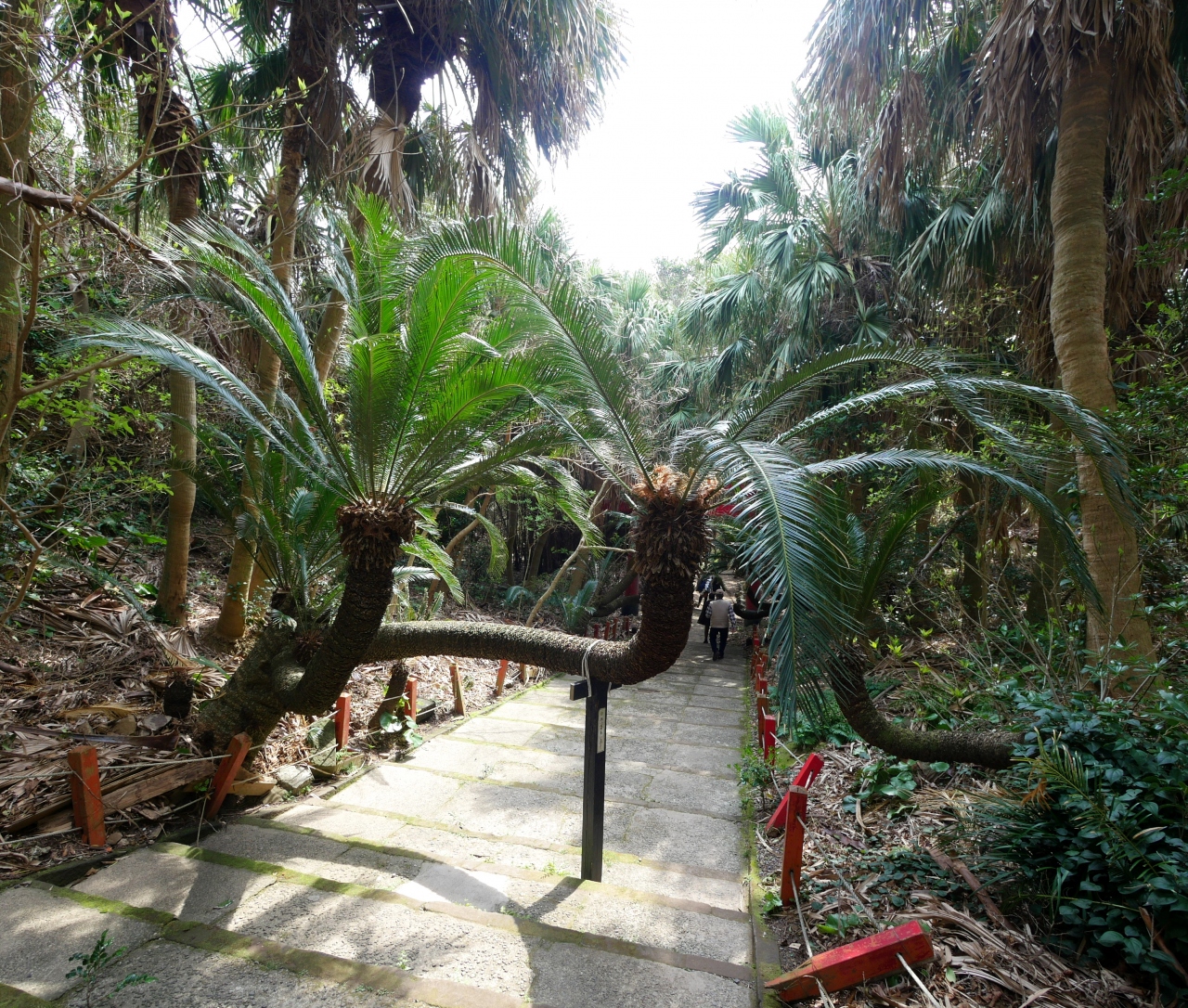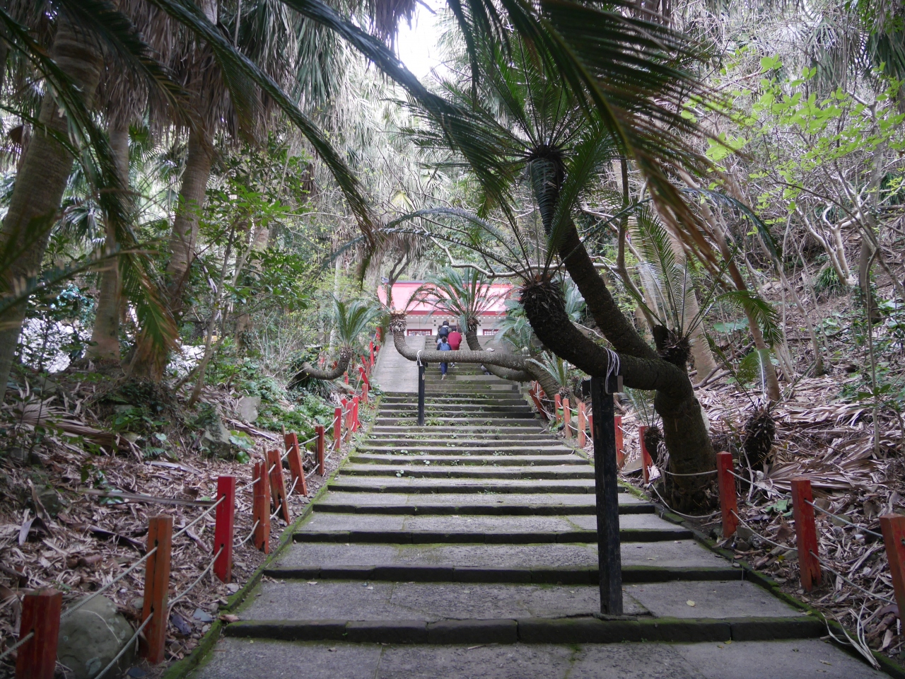 佐多岬の駐車場,観光案内所から歩行者用トンネルで4分.出たところに神社がある.7-8世紀からの古い神社だが,今は簡素な拝殿があるのみ.しかし神社から下の階段の周りは蘇鉄や,亜熱帯性の樹木でうまり,さながら沖縄のようだ.現在佐多岬は工事中で高齢者だとここから15分の上り坂はきついと思うが,少なくともこの神社までは来るべきだ
