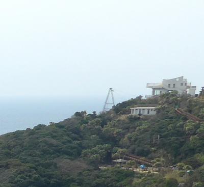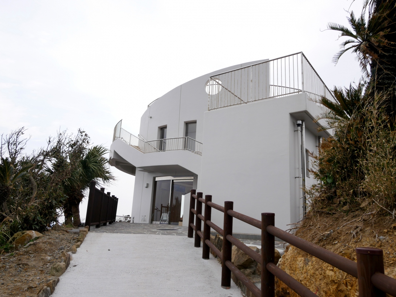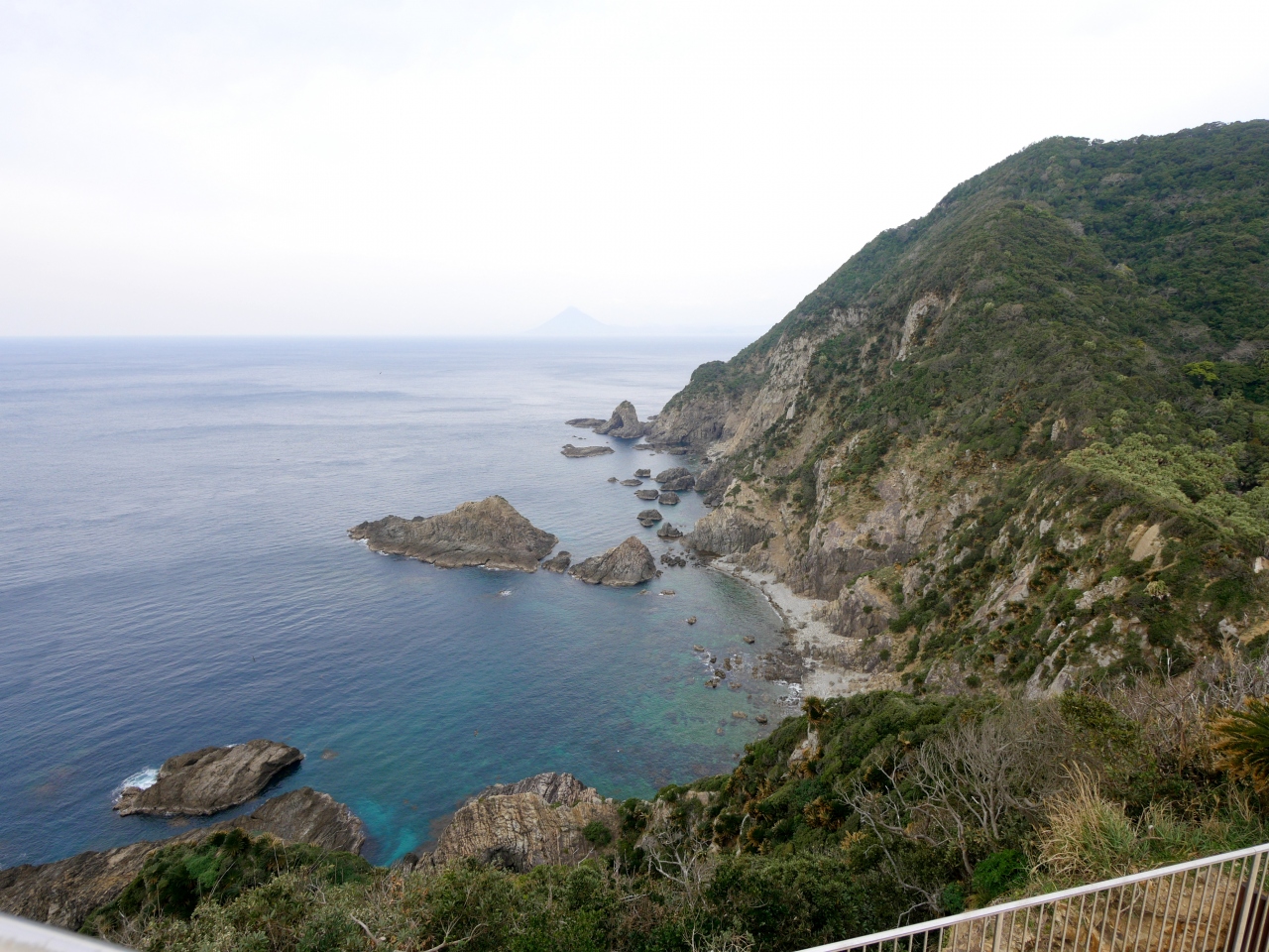 現在遊歩道工事中で,灯台守広場には行けず,更に大きく迂回しなければならないことを知る.ただ1月15日に新展望台ができたことはなにより良かった.エントランスの展望台でその景観を見てから,観光案内所でコーヒー.ライスバーガーのみあり,私のみおなかが減ったので食べた.国産牛を使用した地場の物であるせいか,600円と高かった.それ以外に食べ物はなく,近くに食堂はないので,昼食は事前にとるか,コンビニで買っておくとよい.工事中の遊歩道を新展望台まで歩いた.ここからの佐多岬灯台のある大輪島や遠く竹島,開聞岳などが見えた.天気は曇りだったがそこそこ海の青さを感じることができた.しかしここの遊歩道づくり,ロープウエイまで通して大工事だね.工事終了が待たれるが,それまでは少し健脚が必要.上り坂20分ほど