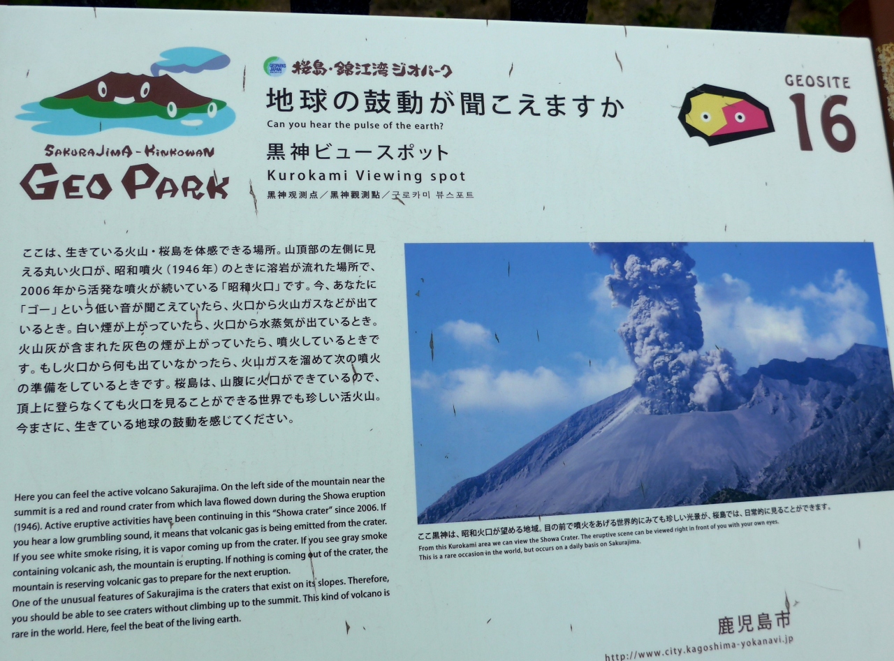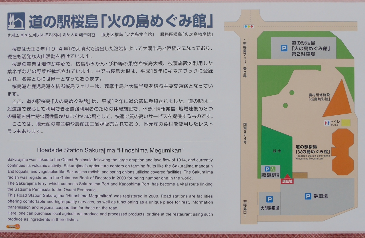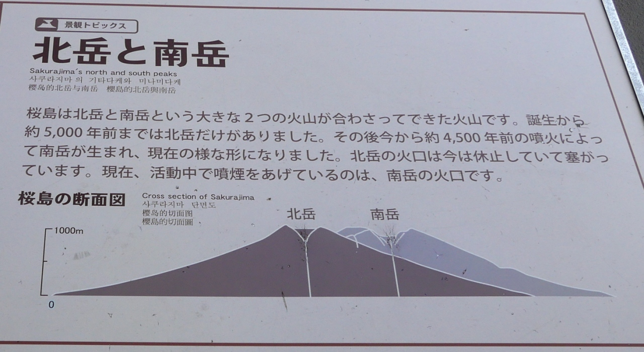 なかなか細かい解説をわかりやすくかいてある.湯之平展望所の解説の方が地学的には専門的な気がするが,ここでは歴史と自然に重点が置かれていた. 場所がいいので,最初に桜島の知識を入れるのにはうってつけだろう.ライブ映像もある.目の前の溶岩なぎさ公園には足湯もあるし,目の前に鹿児島市街が広がる