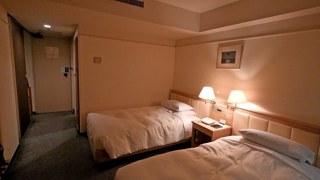 古い5つ星ホテルの風格.ツインのシングルユース.部屋も風呂場も比較的広く使いやすかった.ただ特別にいいということもなく,まあ普通といったところか.朝食は14階の千羽鶴に.まあまあの朝食,明太子と鮭はおいしかったが,もう一品あるとインパクトがあっていいと思った.しかし材料の質がいいので合格.老舗の魅力はあるホテルだ