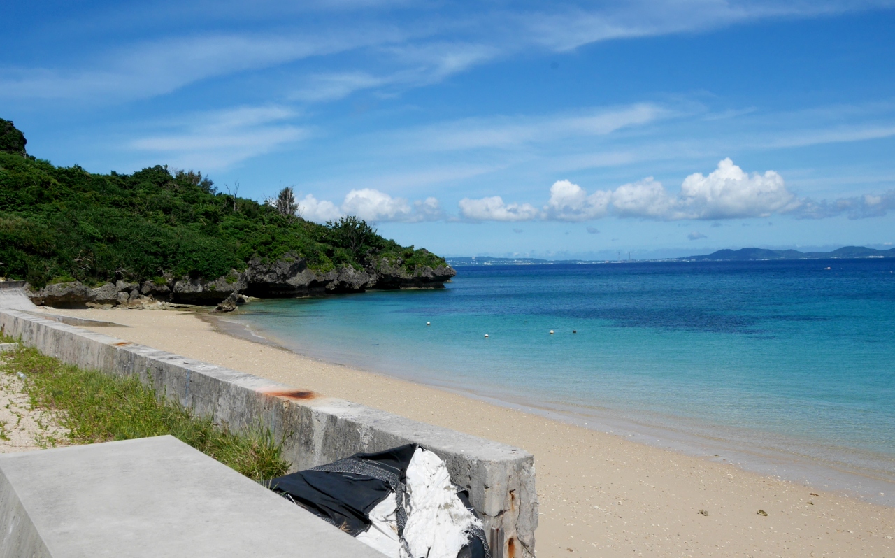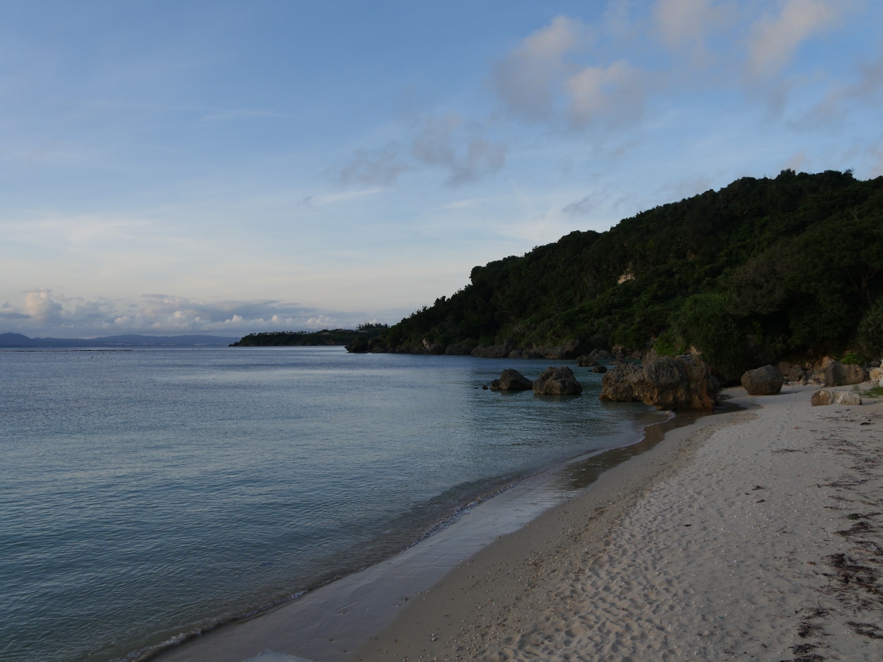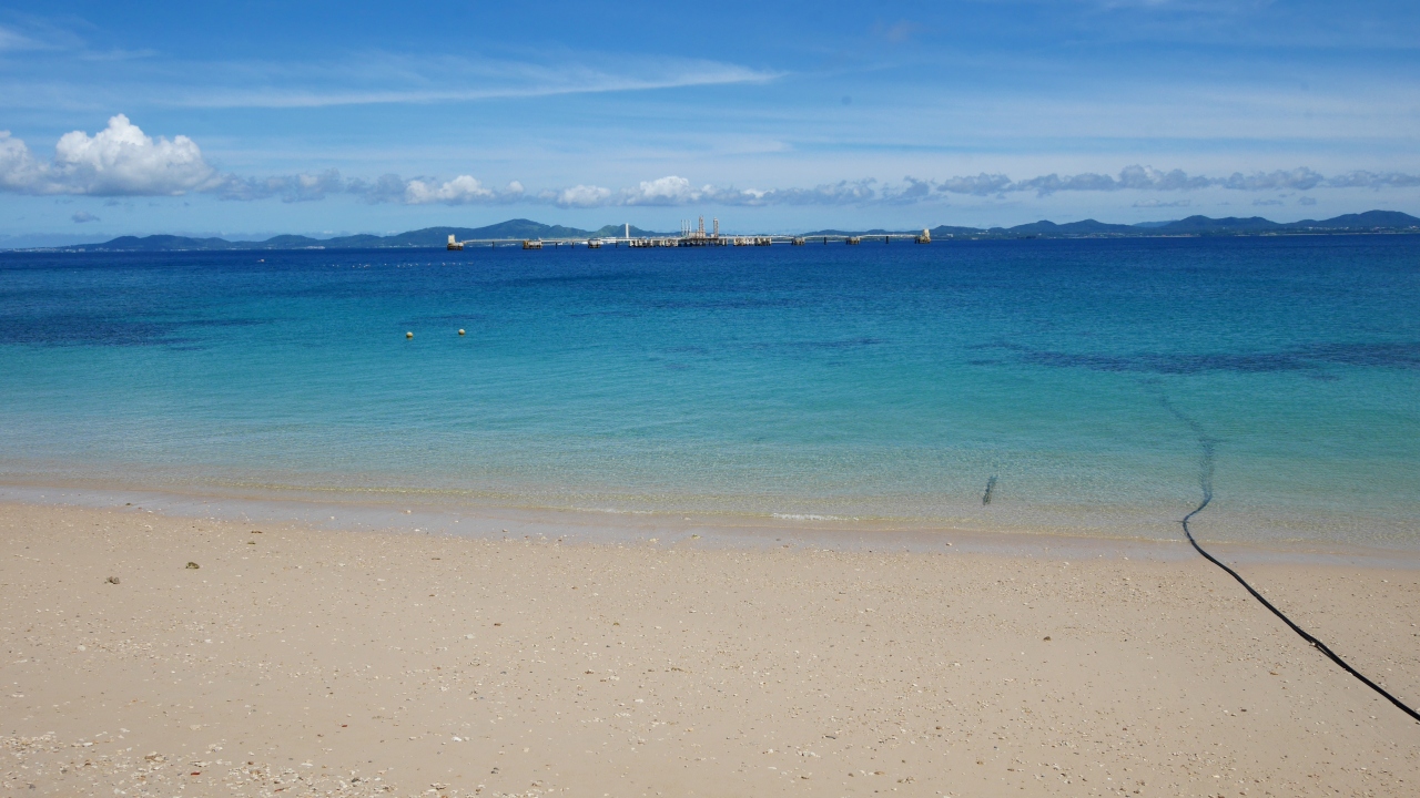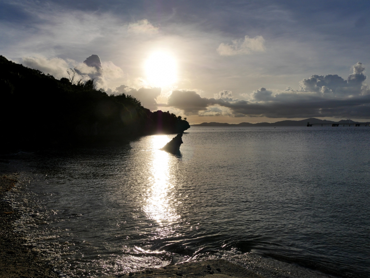 宮城島の一番奥の方にあるビーチ あまり人がいないビーチだが,ここからみる夕日はとてもきれい.金武湾と沖縄本島に陽が落ちていく.内側の海なので波もそれほど高くないビーチ トロピカルな夕日をゆっくり眺めるにはいい場所だと思う