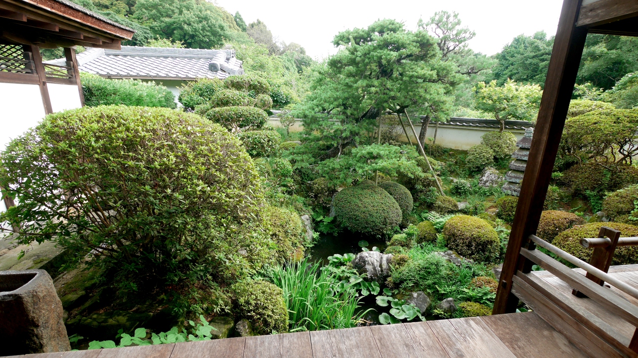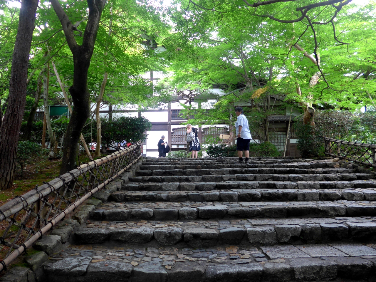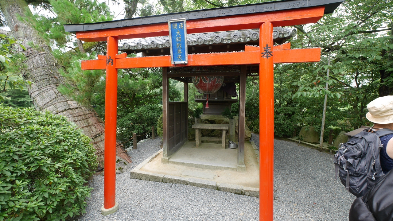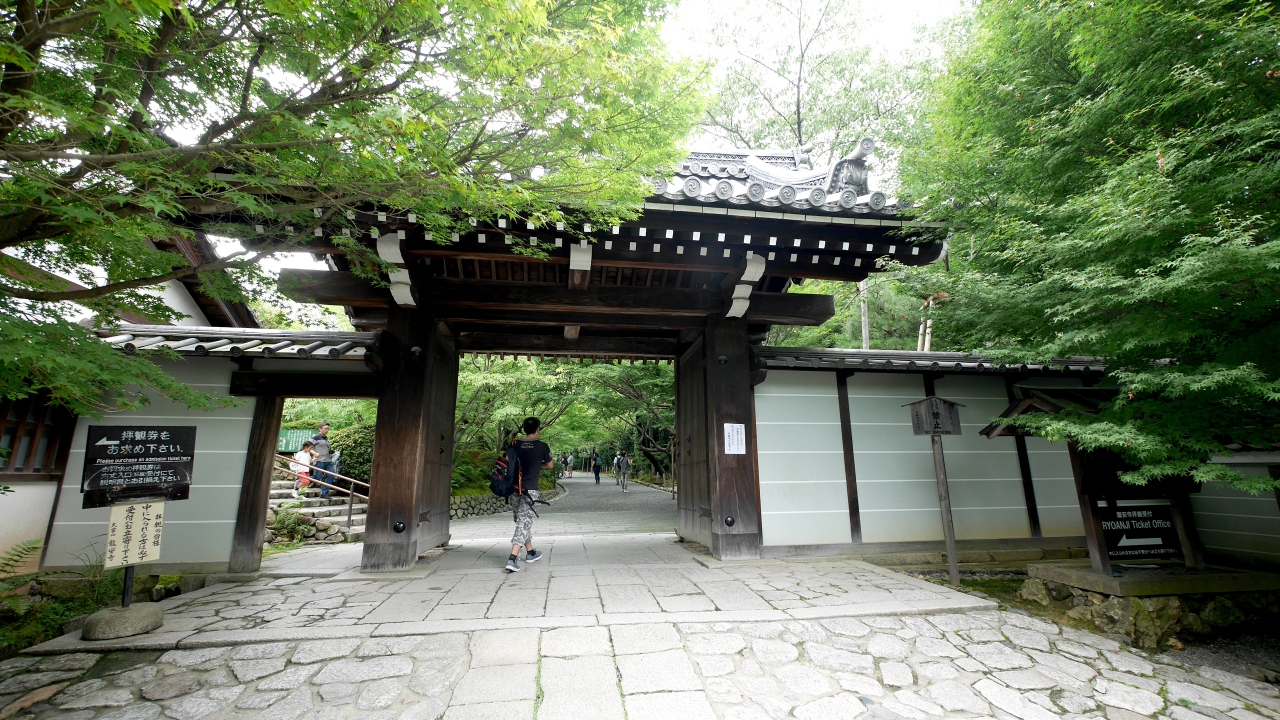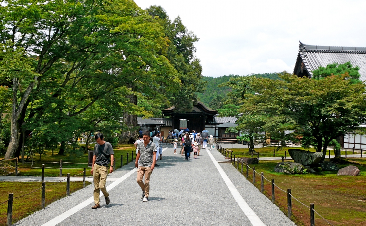 ここの駐車場は無料!おおくの社寺が駐車料を徴収するのに,非常に良心的.また参道や池の緑がとてもきれい.真夏にいっしょに行ったフィンランド人もこの緑にほっとしたよう.鏡容池のたたずまいや,弁天様もいい感じ.この石庭の意味を考えると,まあ大変だが,この風情だけでも感じてもらえてよかった.ともかく駐車料がかからなく,拝観料も500円と比較的安い
