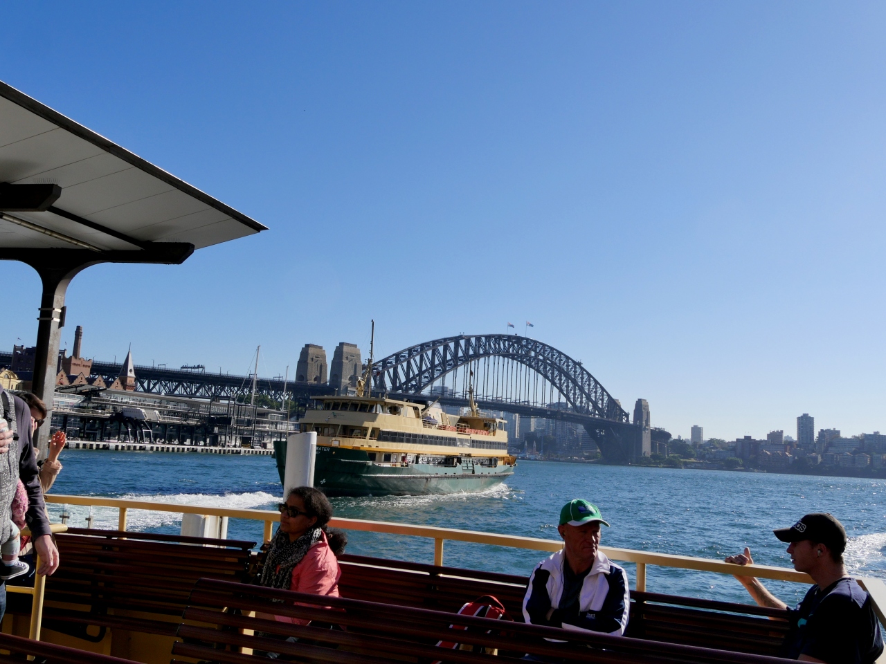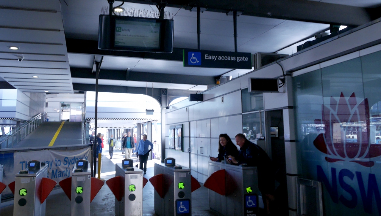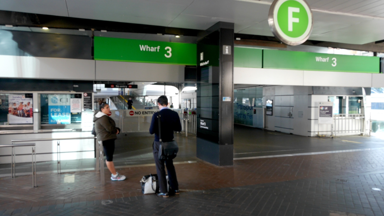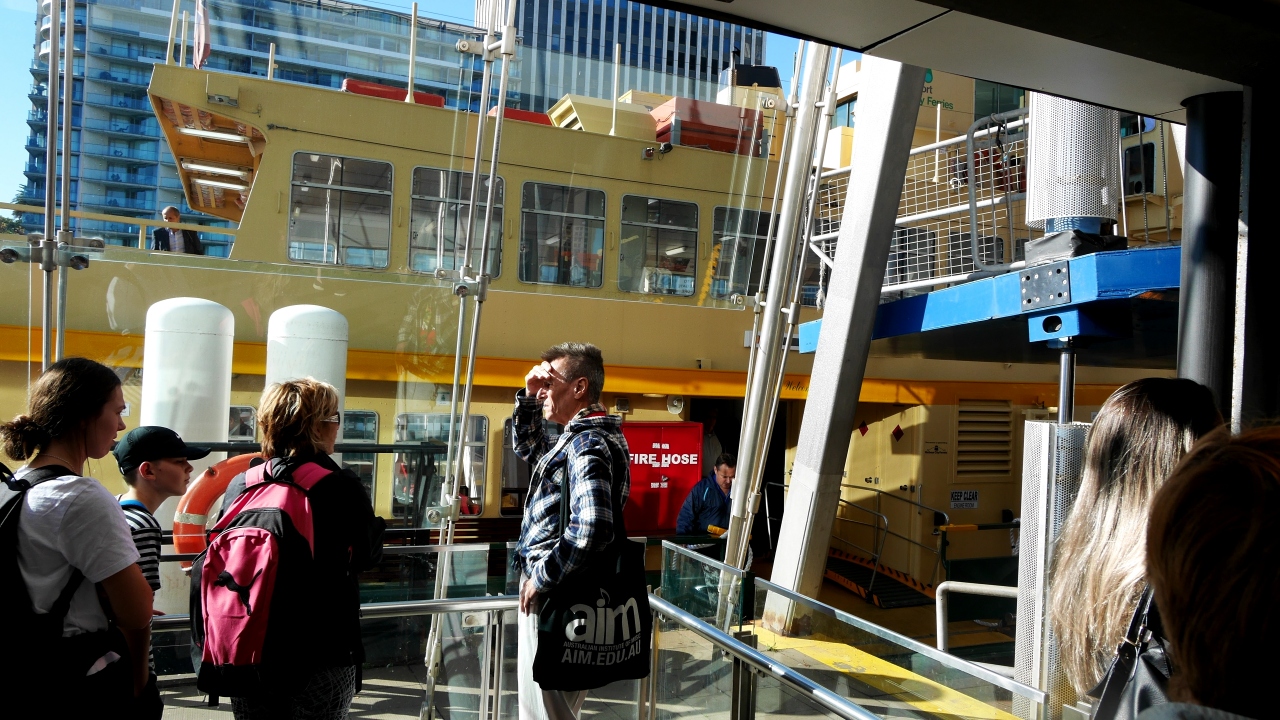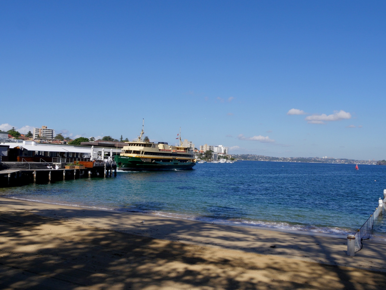 Circular Quay 駅の目の前のWharfから,Sydney Ferryがでる.電光掲示板に行き先と何分後かの出発が掲示される.F1-F7がある.Wharfは2から6までの5ヵ所.私はF1 Manly行きにWharf3から乗った.30分おき.所用30分.当然OpalをTap onするだけ.