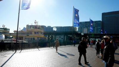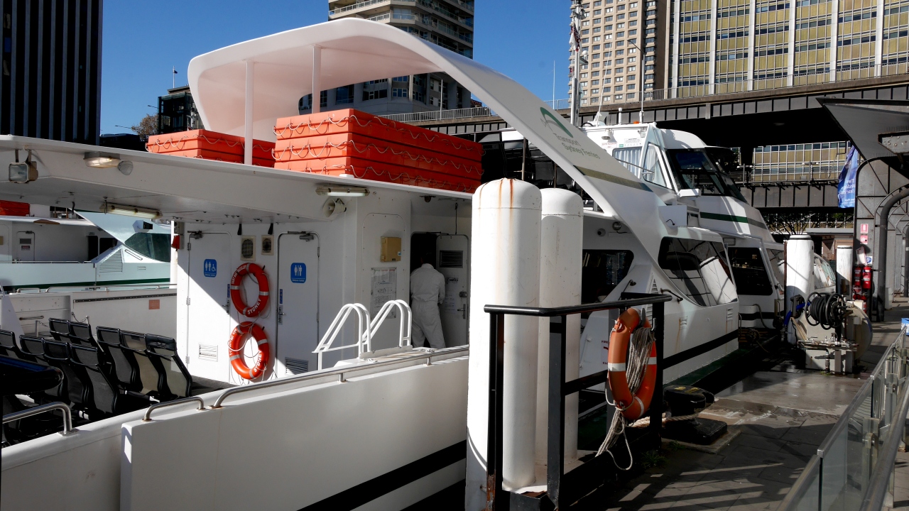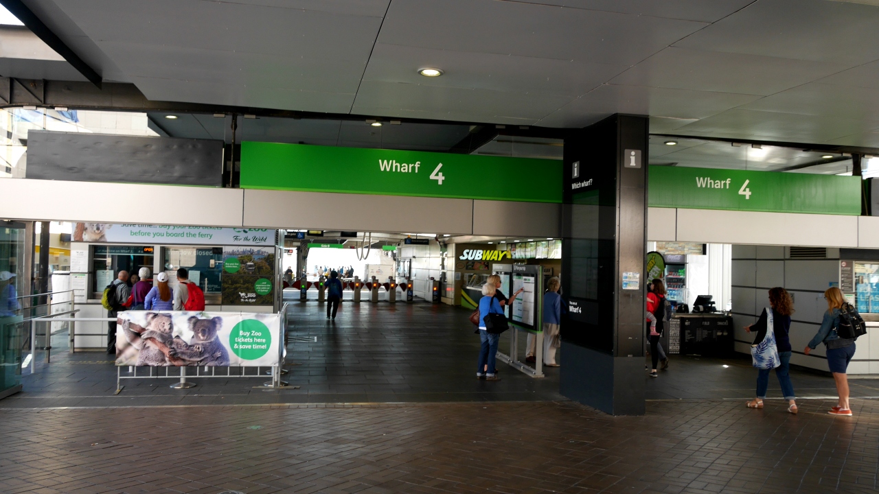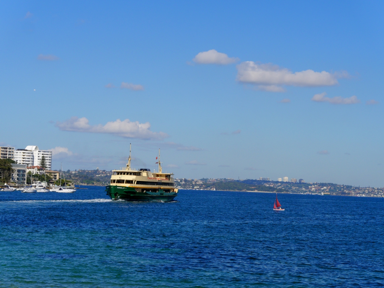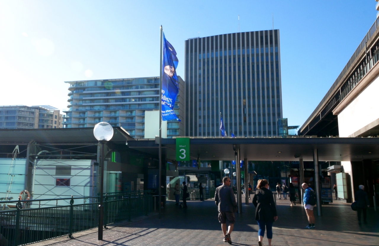 Circular Quay 駅の目の前のWharfから,Sydney Ferryがでる.電光掲示板に行き先と何分後かの出発が掲示される.F1-F7がある.Wharfは2から6までの5ヵ所.私はF1 Manly行きにWharf3から乗った.30分おき.所用30分.当然OpalをTap onするだけ.