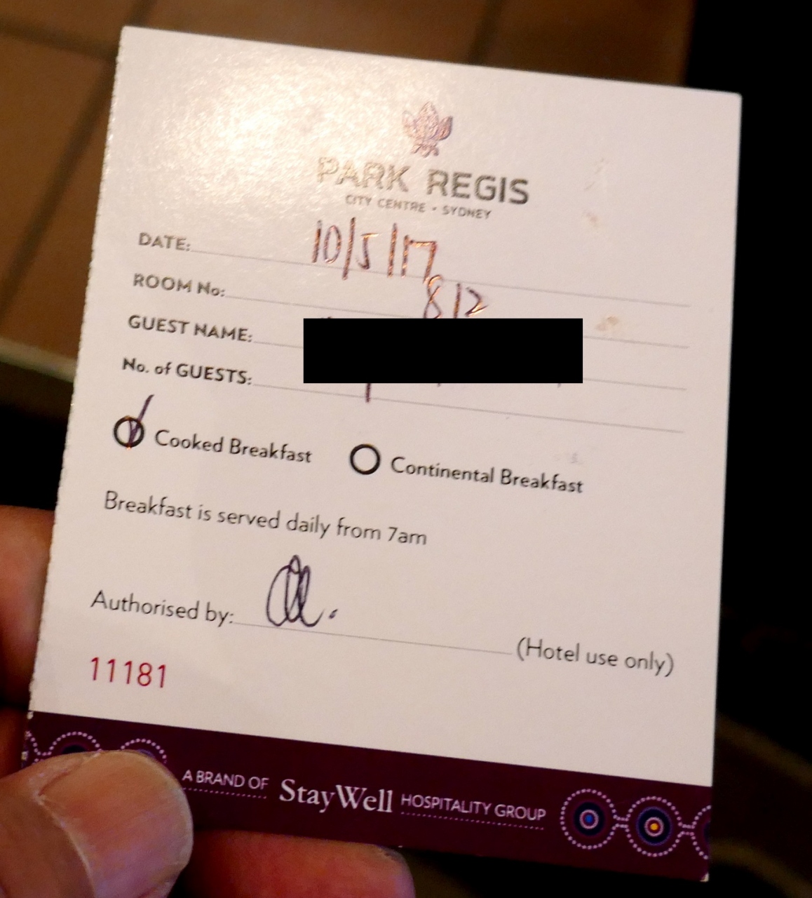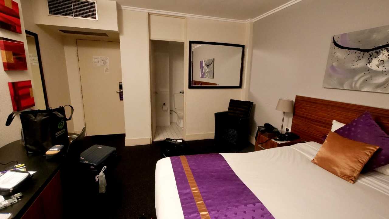 3つ星.20070円.まあ普通のビジネスホテル.物価の高いシドニーではこんなものだろう.閉口したのは朝食が隣のコーヒーショップだったこと.6つのコースになっていたが,まあこんなものだろう.朝食付きが当たり前のヨーロッパ以外は朝食付きにはしない方がよさそうだ.部屋は静かで落ち着いている.ベッドはダブルで広い.シャワーのみ.