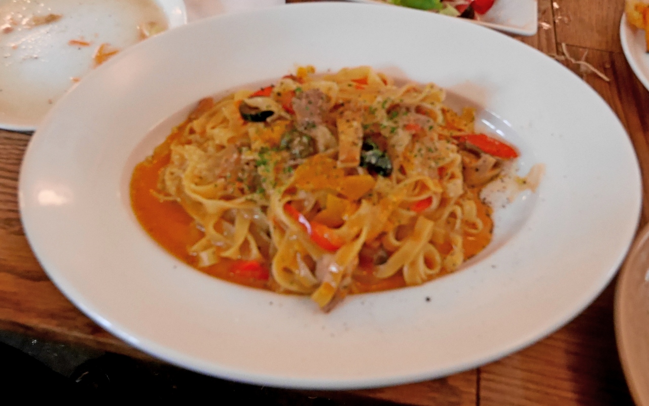 奈良小西さくら通りのオールディダイニングで昼食.一つのパスタとビュフェで1600円と安い.スパゲティも若干アルデンテより柔らかい感じだったがとてもおいしかった,この店は長くいるお客さんが多く込んではいるが入ってもいい店だ.サラダやピザなどが食べ放題.トマト味のフィットチーネおいしかった.ビールなどこみで3人で7560円.安くていい店だった.スパゲティもまあまあ.アルデンテより少し軟らかめだったかな.場所もいい.次回入りたくて行ったが満席!早くいかないとテーブルがないかも