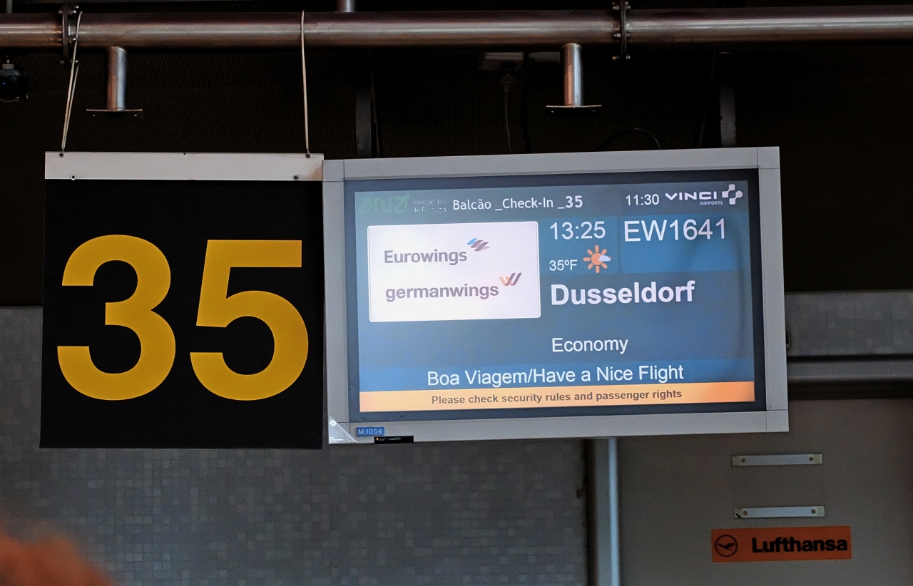 いつもはポルトガル航空などを使っているが,今回デュッセルドルフ経由だったので,ユーロウイングスになった.LCCに近い会社なので,ぎりぎりまでチェックインゲートがわからない.ANAで行ったにもかかわらず,ラウンジも使えない.迷ったり聞いたり大変だった,親会社のルフトハンザの職員に聞いても,まるで分らない.慣れてなければメジャーな航空会社の方がいいと思う