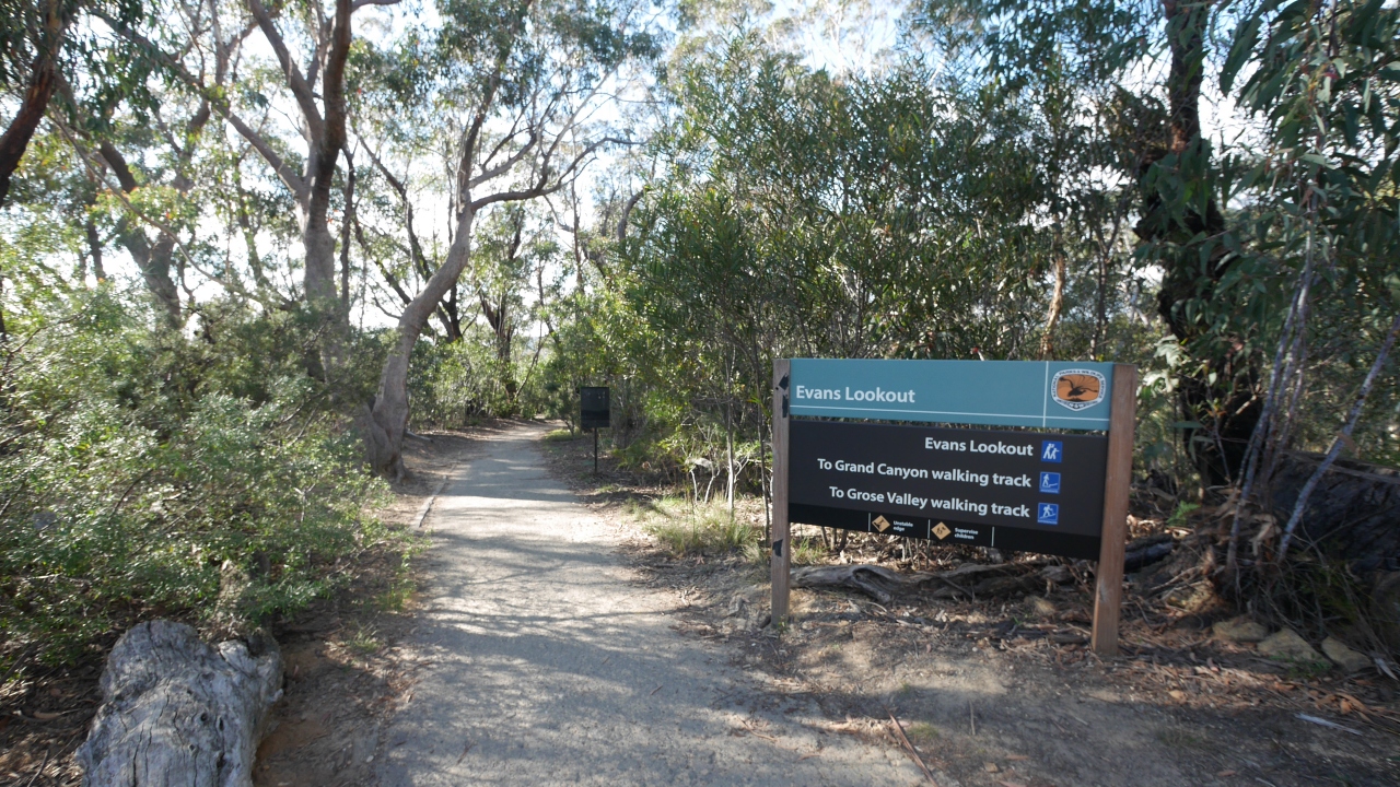 Blackheath手前のEvans Lookout Roadへ左折 約4㎞のところにある.ここからGovetts Leap lookoutまでのハイキングコースがある.途中にBridal Veil滝がある.風光明媚だが私はここよりもGovetts Leap lookoutやPulpit Rockの方が好きだ