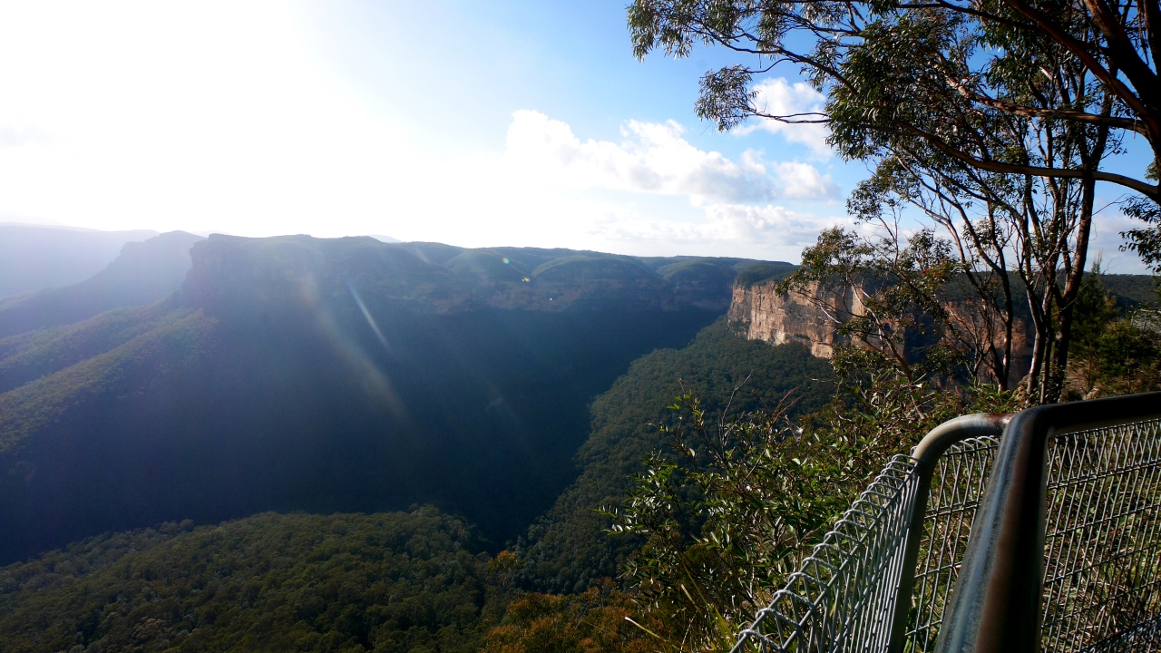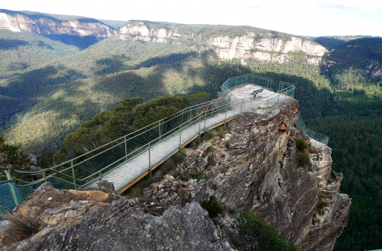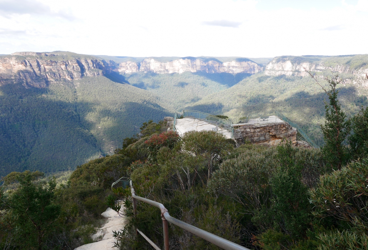 Blackheathの街から一番行きやすいLookout.非常に景色がいい.よくみるとPulpit Rockのすごい展望台の階段もわかる.Bridal Vail滝も良く見える.風でた気が吹き飛ばされるさまも面白い.滝まで歩いても往復30分強だが,滝の近くでは滝の美しさはわからない