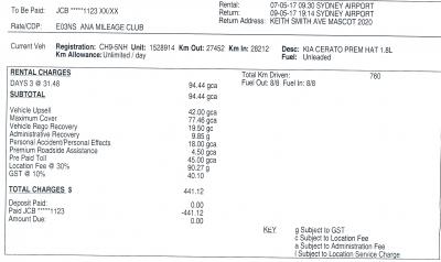 ハーツレンタカー KIA CERATO PREM HAT 1.8Lというオーストラリアの車 ATを借りた.ナビがぼろで原則有料以外の道を案内する.有料の道を選択するのにはひと手間.オーストラリアの有料道路の支払いが面倒なので(私はHERTZのPre Paid Tollに入っているのでいいのだがそのような設定にはなっていない)3日目にえらい目にあった(ものすごい遠回りをすることになる).このときは偶然にいろいろいじっていたら有料道路を含むナビがでた.