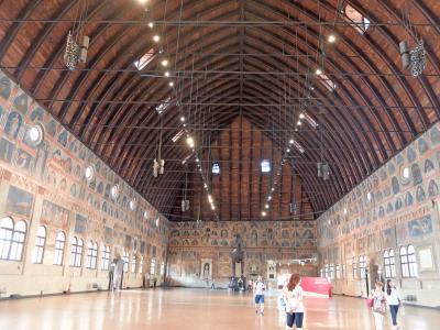 ラジョーネ宮はとても面白い建物だ.全体ではサロンで78×27m,高さ27mとすごい広さ.上はまるでひろい掘っ立て小屋のような屋根.その下にフレスコ画.占星,宗教,学芸,日々の仕事という15世紀の連作.なんともすごいたてものだ.むしろ私は外のバルコニーがなかなかすごいと思った.中世の自由都市の面目躍如というところか.