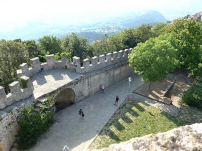 第二の砦La Cesta o Fratta チェスタの塔に向かう.ここからの第1の砦の眺めも素晴らしい.砦が本当に機能していたことがよくわかる.最後に第3の塔 Il Montale も近い.ずっと尾根伝いの気持ちのいい道,片側は絶壁だ.これでは攻め込むのが大変だったろう.良くこんな断崖絶壁の山があったものだ.第一の砦 La Rocca o Guaitaがきれいにみえる.第二の砦が一番高く749m.第一の砦は738m ティターノ山頂が750m 雪渓も素晴らしくサンマリノ観光のハイライト 中は武器の博物館 MULTIMUSEOカードはすべての博物館などに入れる入場券9ユーロ,カード代1.5ユーロ(返金可能)あわせて10.5ユーロ