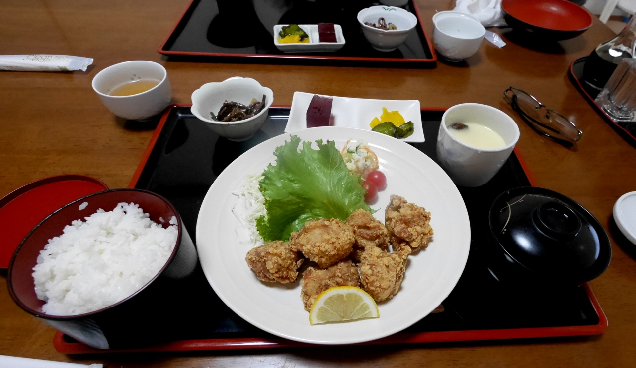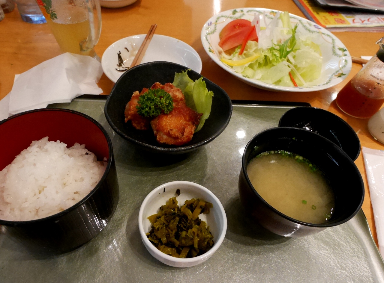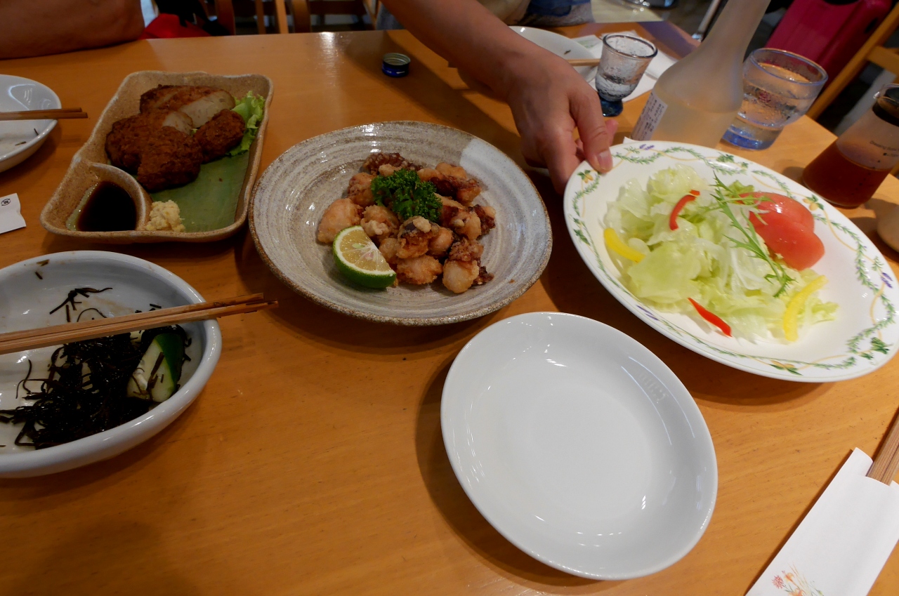 最初もう一つの「なな瀬」という店に入ったが,つまみ類があんまりないのでこの店に移動.台風が近づいていて,出発時刻まで3時間半あったので,ゆっくりと食事とお酒(私は後で運転するので飲めなかった)まあまあの味.ごはんセットにおつまめからあげでご飯にした.安く済む!