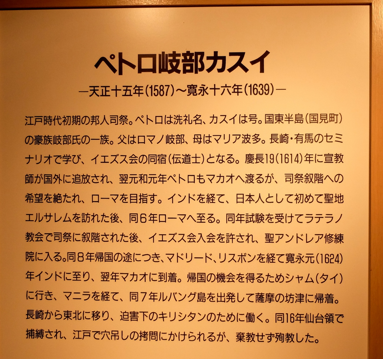 ペトロ岐部カスイの展示を見たかったからだ.以前から日本人で初めてエルサレムを訪れた男.ローマで司祭になった男として知っていた.確かにすごいところを行ったね.エルサレム,ローマばかりでなくヴェネチア,モンセラット,エヴォラそしてリスボンに行ったんだ.その記念のスペースが大きいが,そもそもこの資料館の建物自体が明治初期の庄屋屋敷だ.そのた郷土の美術品や民俗展示もあるがやはりペトロ岐部の展示が圧巻!