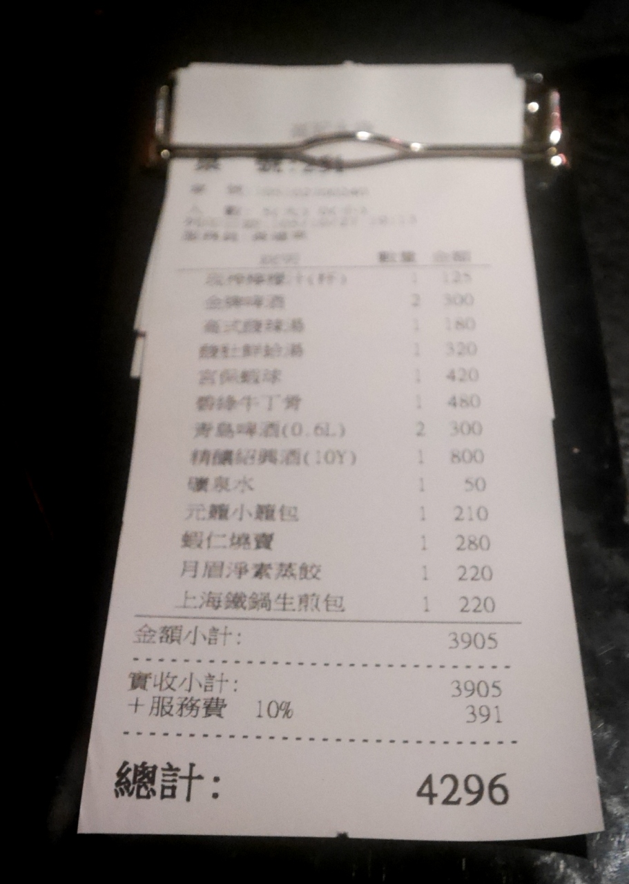 2人で565元 お茶が160元もした.最初に注文にウエートレスが来て,注文を取り,注文書をおいていく,それを持ってレジでお金を払う.お金を払うと正式なオーダーになるようだ.- 旅行時期