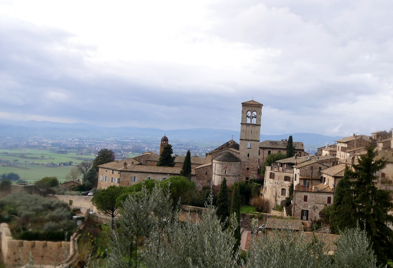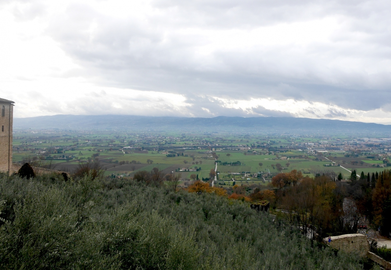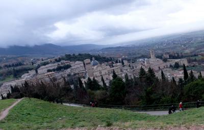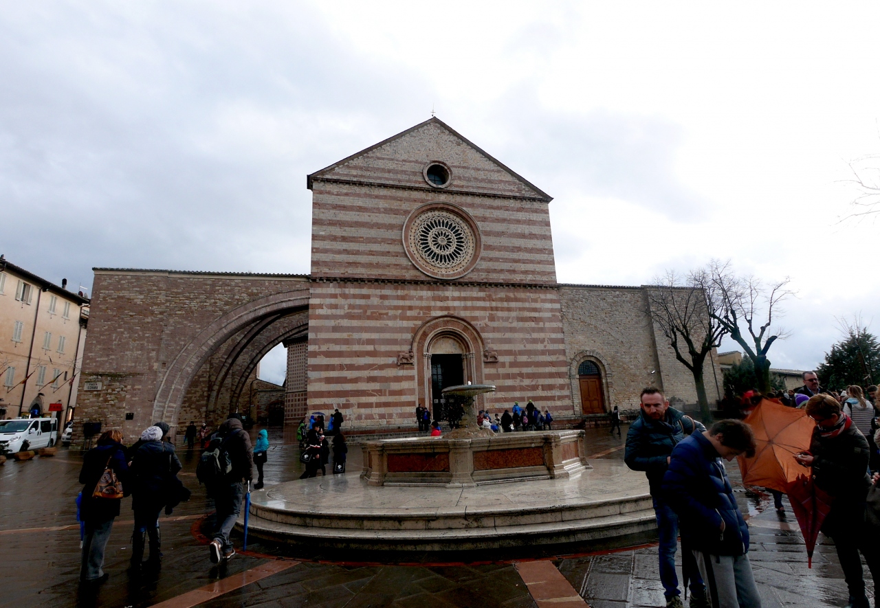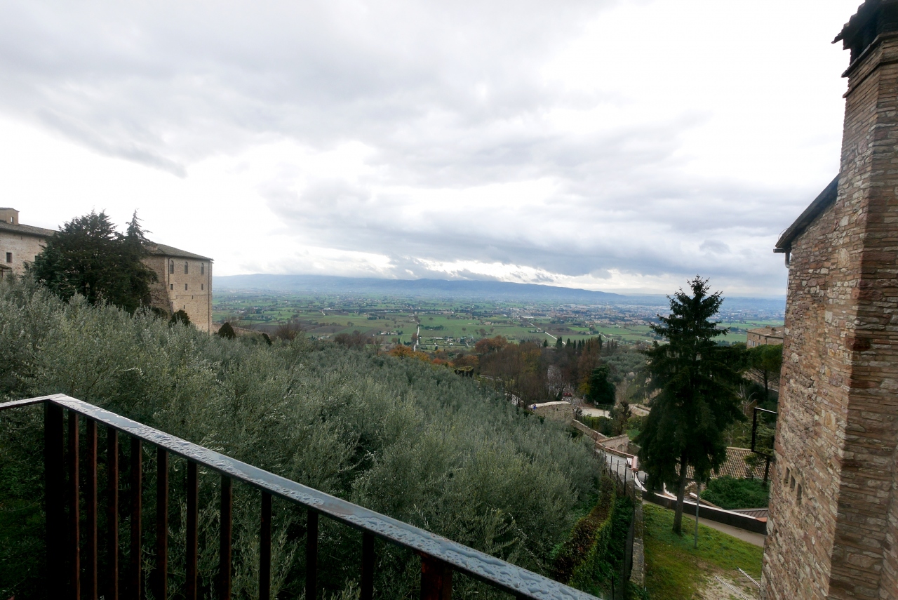 サンタキアーラ教会も素晴らしい聖堂.中は撮影禁止.加えて素晴らしいのは広場からの眺め.アッシジがイタリアの中世の街によくあるように,高台というか山の上にあることがよくわかる.ここからの眺めは絶景だ.もちろん大城塞からの眺めも素晴らしいが,そこまでいかなくてもここで出会える