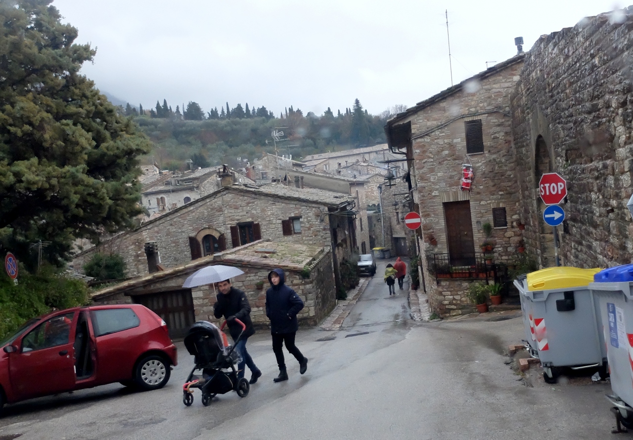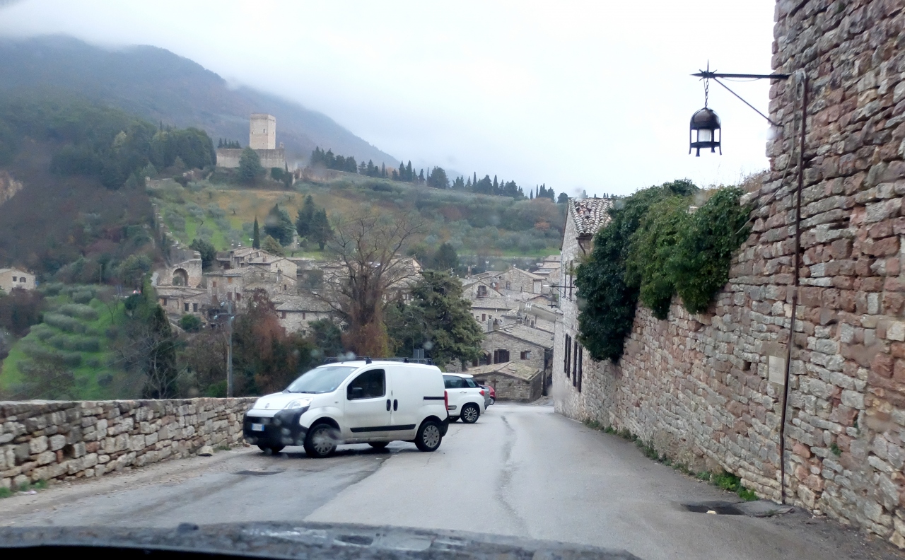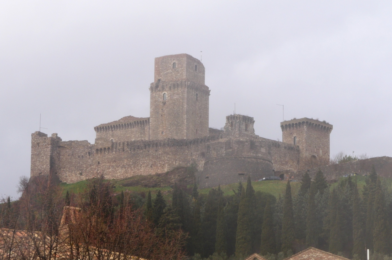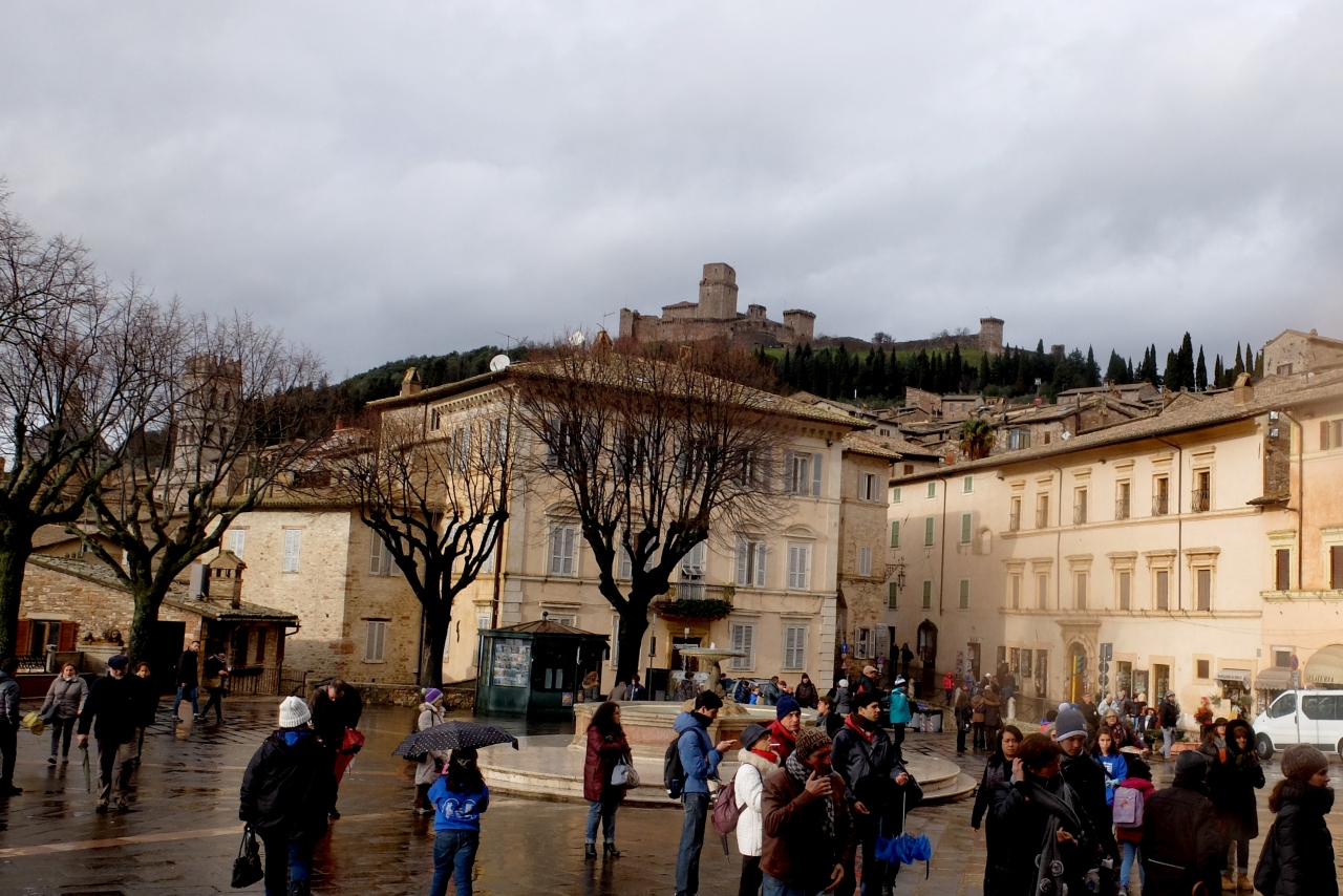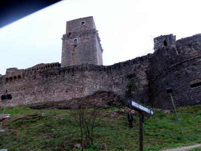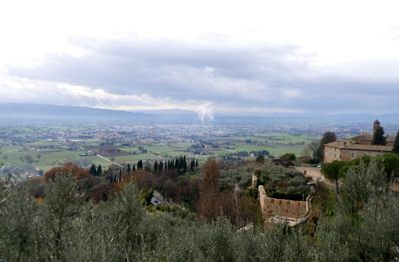 サンタキアーラ教会も素晴らしい聖堂.中は撮影禁止.加えて素晴らしいのは広場からの眺め.アッシジがイタリアの中世の街によくあるように,高台というか山の上にあることがよくわかる.ここからの眺めは絶景だ.もちろん大城塞からの眺めも素晴らしいが,そこまでいかなくてもここで出会える