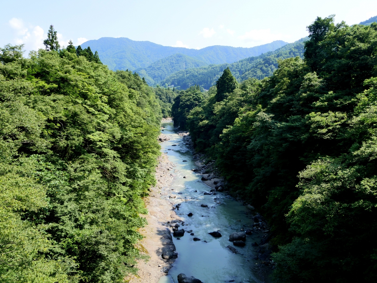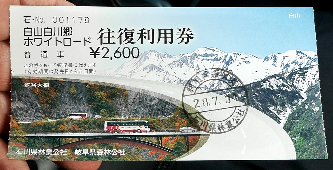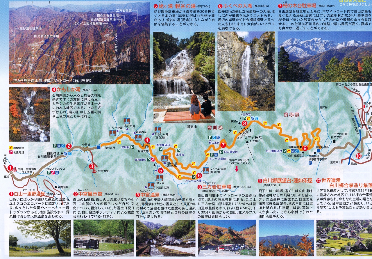 眺めがよく,深い蛇谷渓谷とフクベの大滝などの素晴らしい景色が魅力.晴れていれば白山も白山展望台から見ることができる.1450mの涼しい三方岩トンネルを越えると,白川郷の一部(北部,肝心な萩町はみえない)がみられるし,展望台もあるが,それより先は下るだけ.片道1600円(有料道路内のUターン可)往復2600円であり,景観からいってもこの三方岩駐車場かもう少し先の太平洋という岩壁をみたらUターンすればよい.