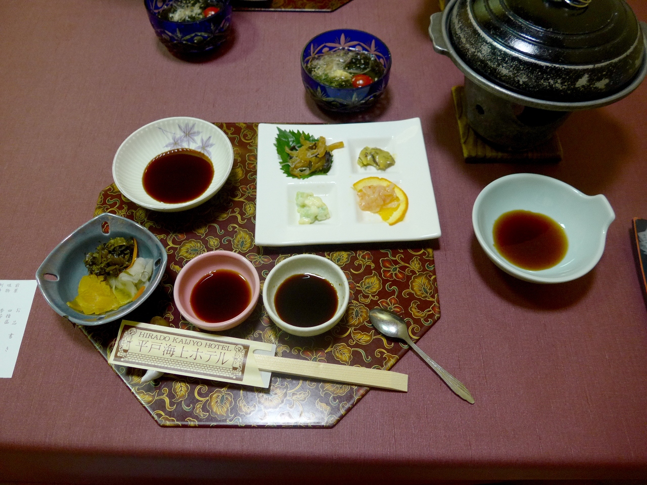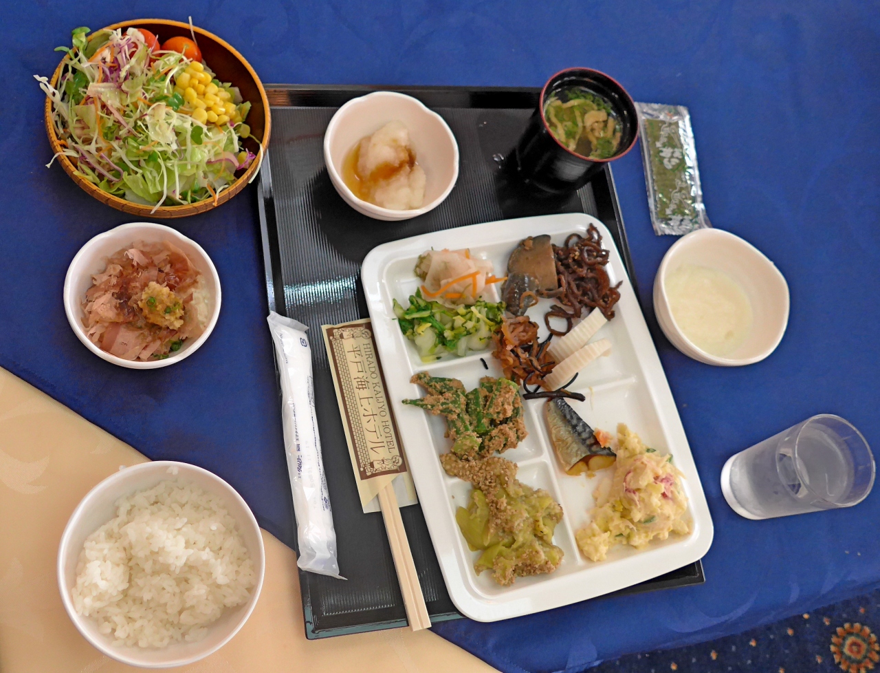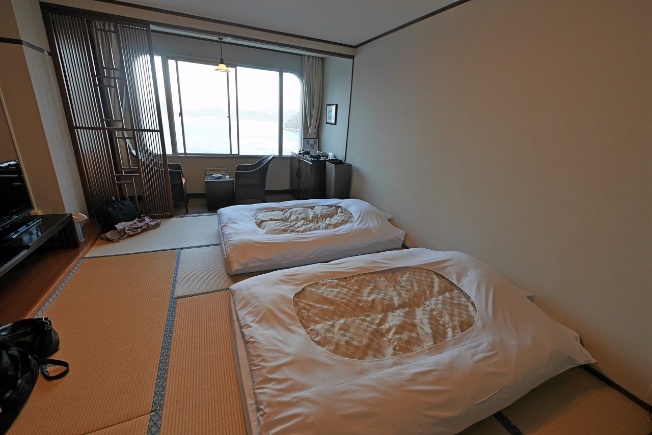 部屋は普通の和室,部屋からは海が見えて絶品.この景色代のような気がする.風呂は海が見えてきれいだがサウナはない.食事は専用の個室で食べるが,これは種類も豊富でなかなか良かった.朝食は並みのバイキング.大広間といいこれはもう少し工夫がほしい.1泊二食付二人で36720円ならこのくらいかな.コストベネフィットはまあまあだった.平戸市内に近くてこの景色ならおすすめ.