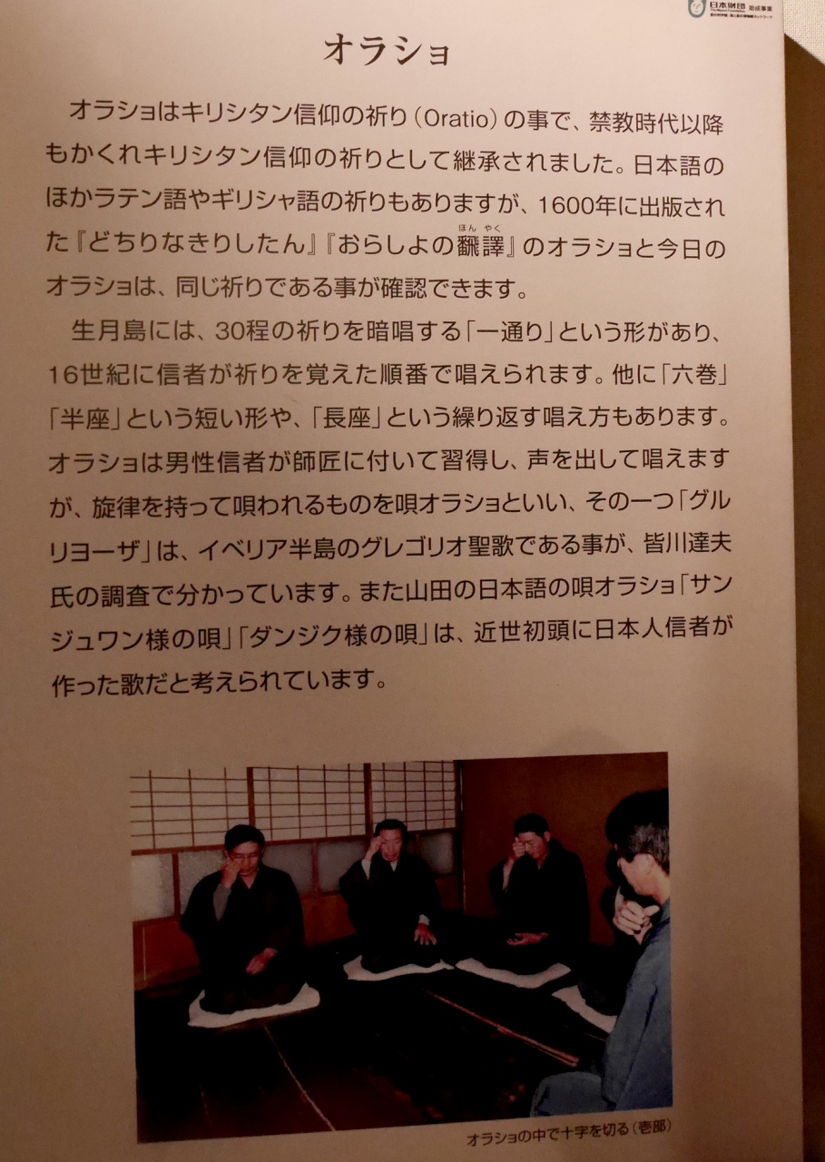 隠れキリシタンの歴史がよくわかった.オラショなどにグレゴリオ聖歌をよく保存しつつも,神仏の奥で祈る風習から,神仏が捨てきれず,隠れキリシタンのままで,カトリックに復帰しなかった信者も多いという.特にこの生月島には多かったという.中江の島が聖地になったり殉教した人をサンジョアン様として祀ったり,隠れキリシタンが土着性を持っていくことも良くわかった.この歴史は世界でも特異とおもう.世界遺産になることを願いつつも,観光客により荒らされて,そのために見学が制限されていくようになるのもとも思う,この博物館興味がある人にはとても面白いと思う.おすすめだ- 旅行時期