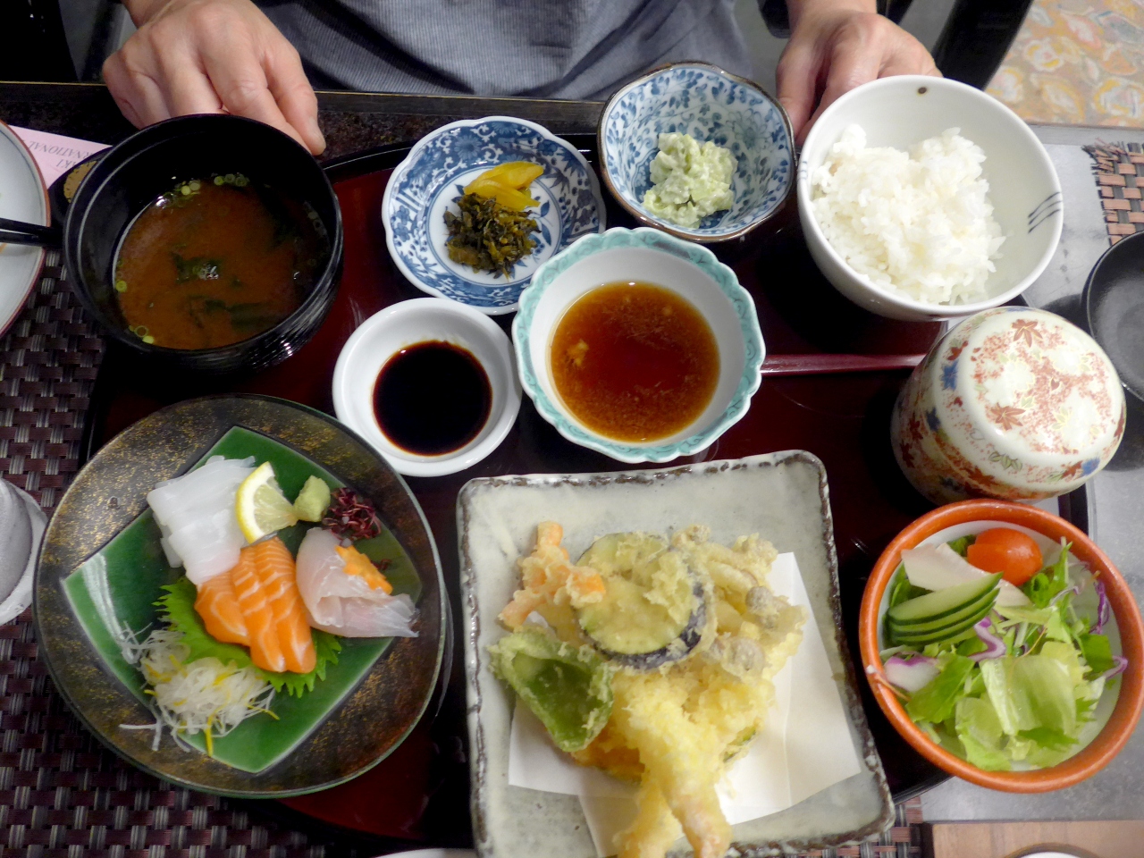 テルの中の和食の桜華という店で,定食と野菜サラダやもずく,アジの刺身などを食べたが全部で6930円と安かった.特に定食のおかずの量とボリュームがすごかった.ホテルの中とは思えない安さと良さだった.このホテルともどもおすすめだ!