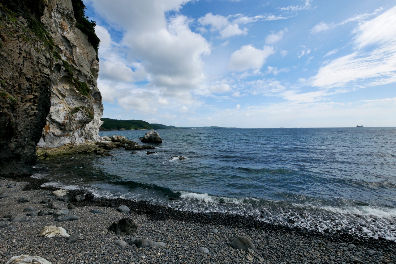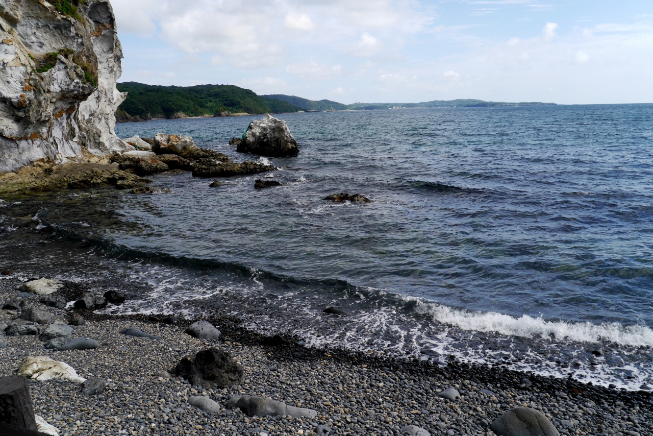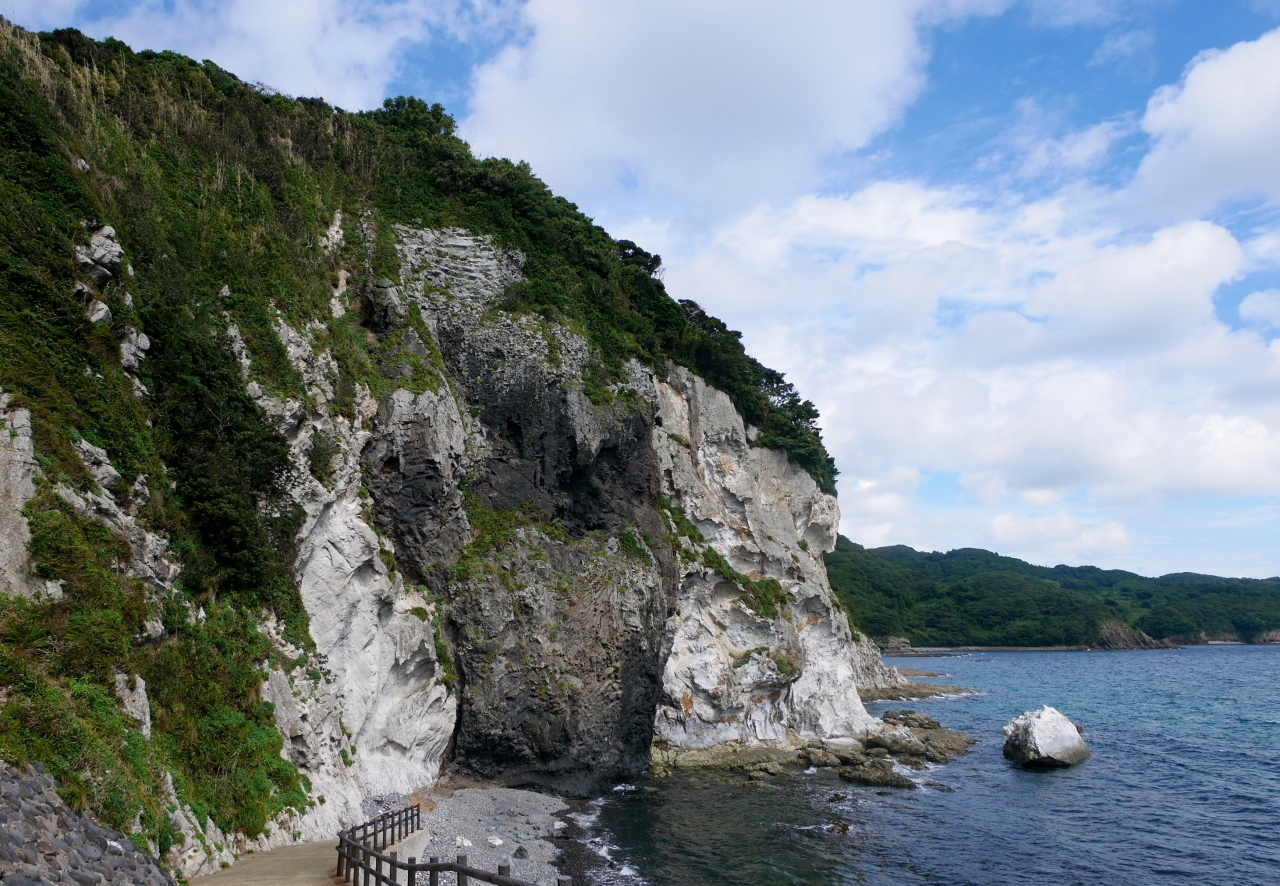 県道175号線で南に行くコースは,観光ルートから外れていてあまり観光客はいない.しかしとても海がきれいに見える.梅津湾などとてもきれいな海だ.「初瀬(はぜ)漁港の北東の海岸に見られる岩脈で、地元では白滝と呼ばれている。この岩脈は垂直に切り立った高さ41mの断崖に露出しており、白い流紋岩の真ん中に黒い玄武岩が下から噴出して、白と黒のコントラストを鮮やかに見せている。」。http://www.ikikankou.com/wp/?p=201