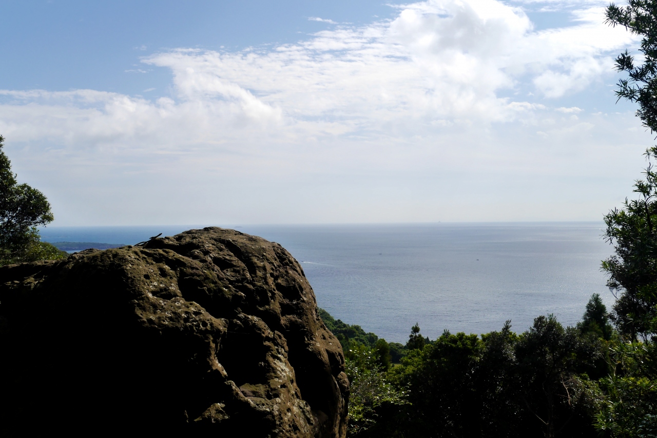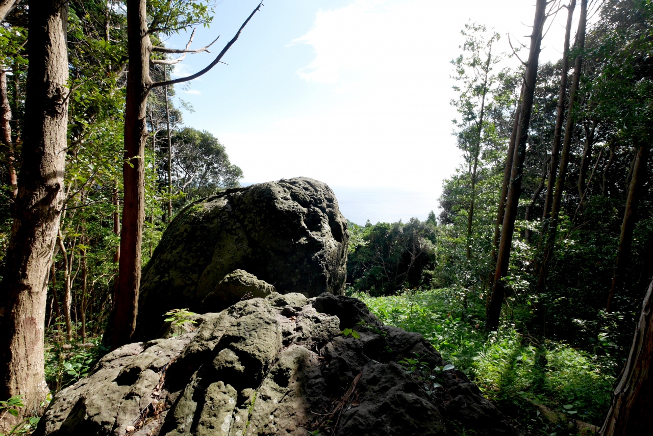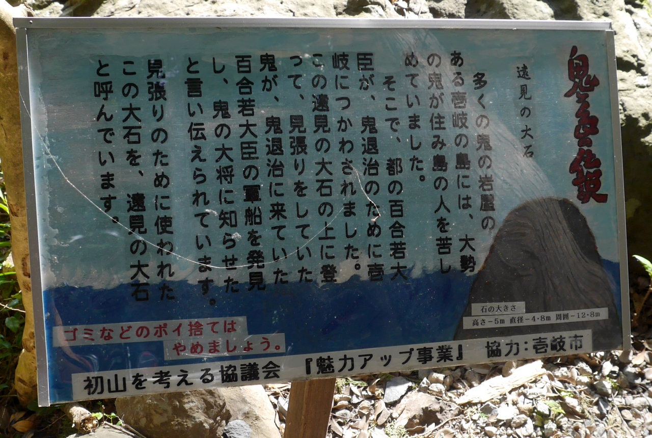 さらにその奥に遠見の大岩がある.大きな岩で都から鬼退治に来た百合若大臣をここで見張りをしていた鬼が鬼の大将に知らせたところという大岩からの海もきれいだ.- 旅行時期
