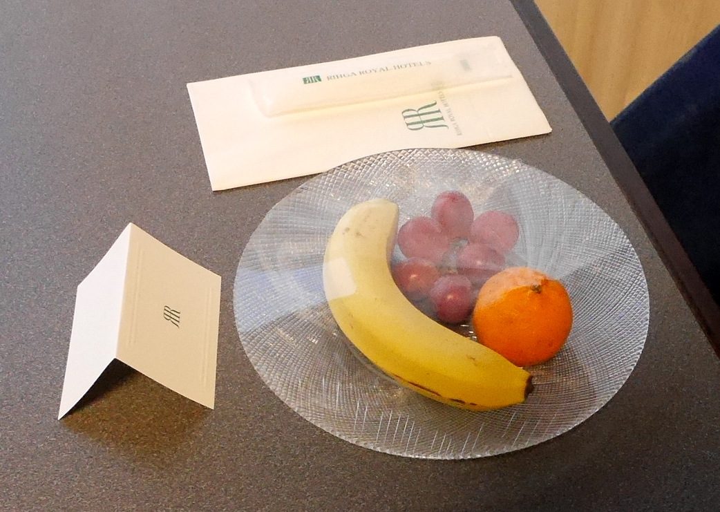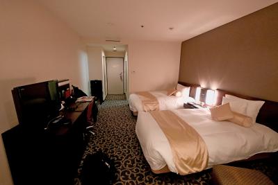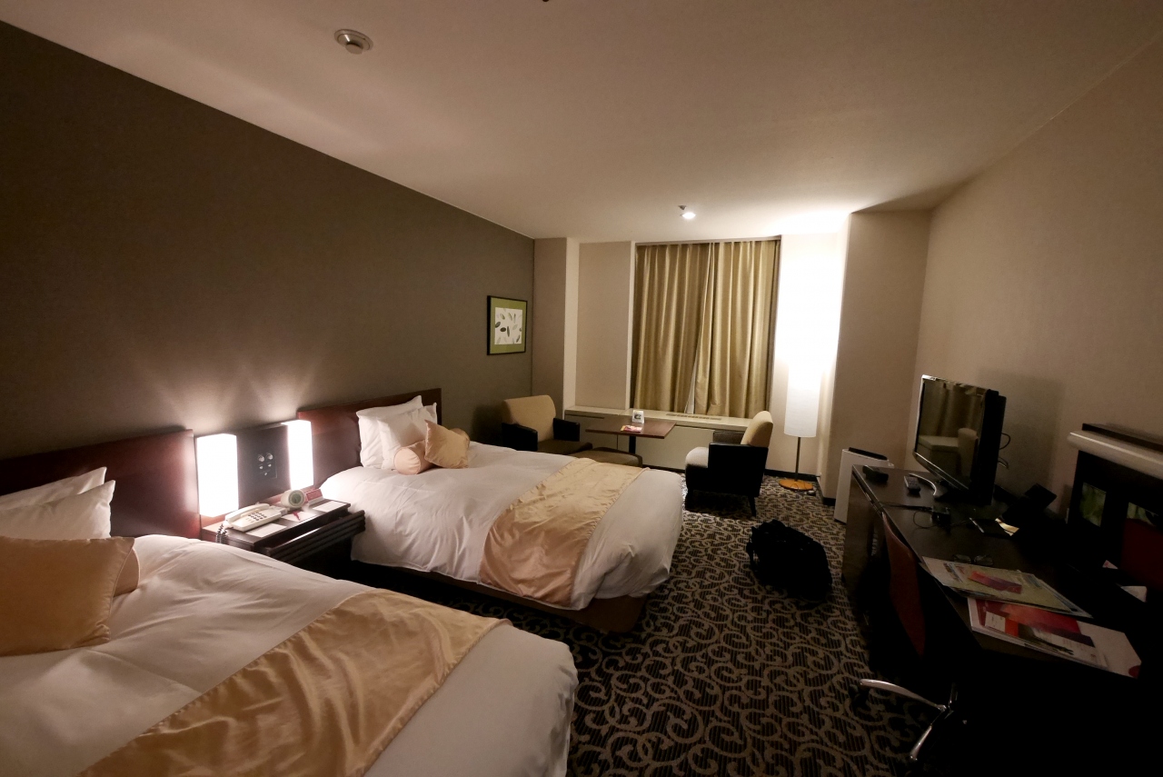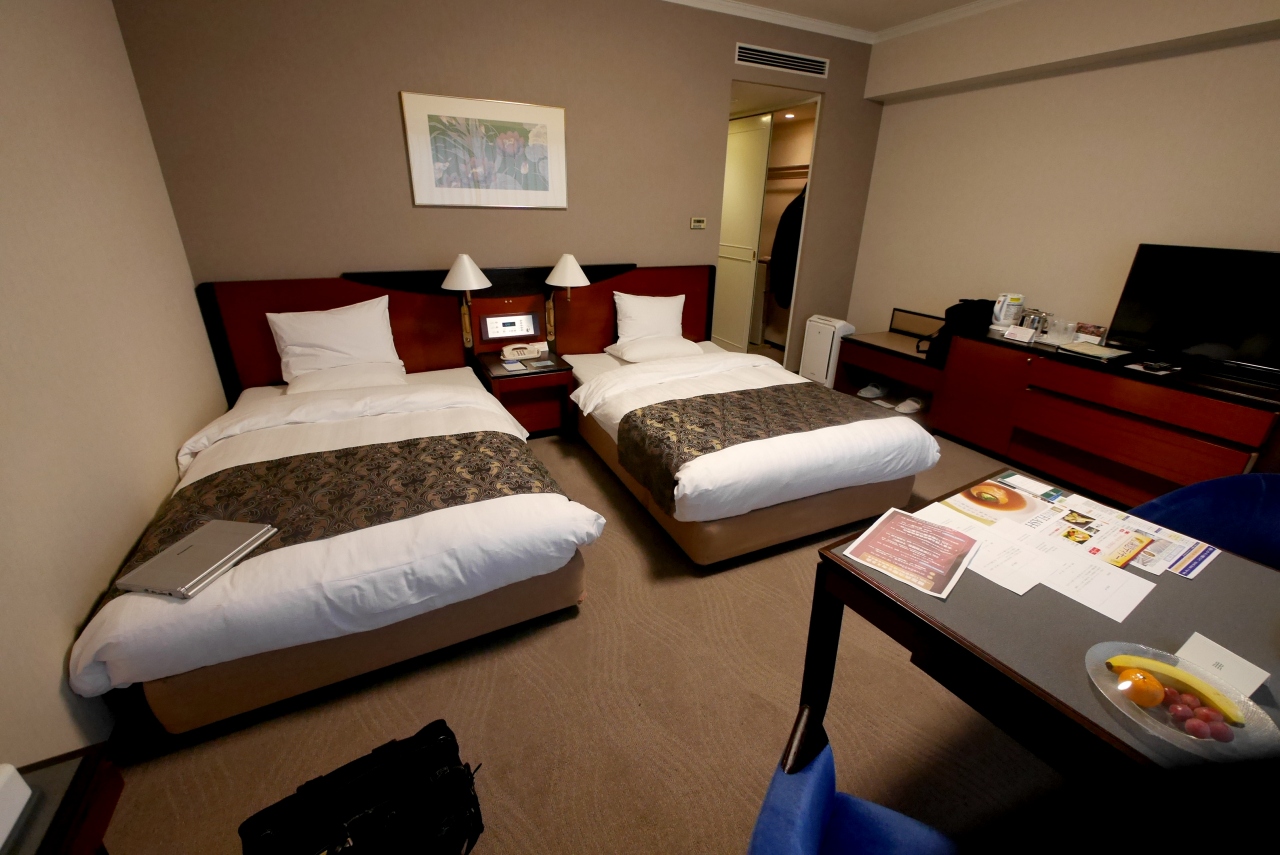 スタンダードルームのツイン.やや古い作りだが部屋は広くて,ふろもまあまあ.果物が置いてあるのがうれしい.アメニティは標準.ミニチュアボトルはない.