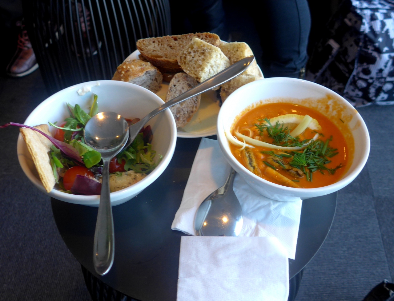 SASラウンジに.確かお金を出せば入られるはずだ.スターアライアンスゴールドで2人,もう一人に210DKK払う.お金で入れるのがうれしい.ビール,ワイン,ソフトドリンク,サラダ,スープ,パン,菓子など,広いビジネスデスクもあるし,高速Wifiもある.物価が高いCPHではむしろラウンジの方が食べ放題なので安い!