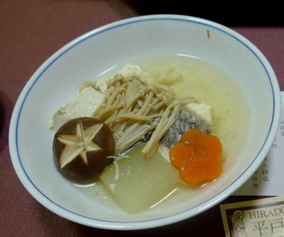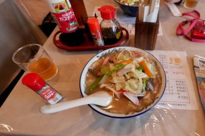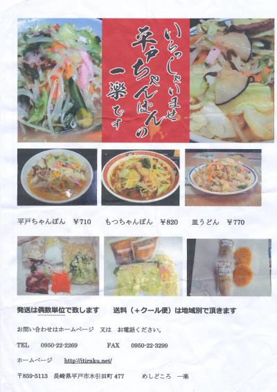 幸橋の前の「めしどころ一楽」へ.昼食時は非常に込んでいる.最初はあきらめ,幸橋を見てから入る.ちょうど二席空いていた.たくさんの色紙.観光地の有名店という感じ.平戸ちゃんぽん ¥710 こくがあってよかった.濃厚だがたべやすい.結構のボリュームもありおいしかった.十分合格!私は長崎ちゃんぽんよりコクがあってよかったが,家人には少し癖があったようだ.あごだしちゃんぽんというのも食べてみたい.