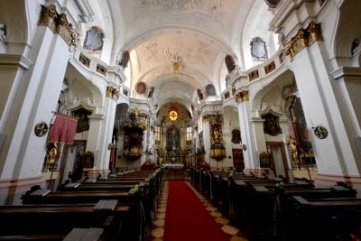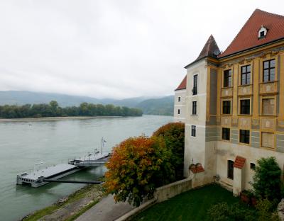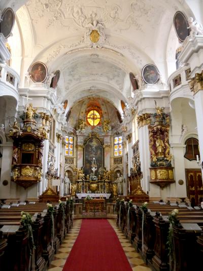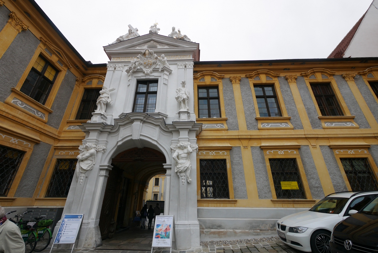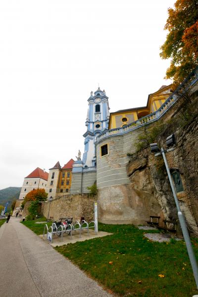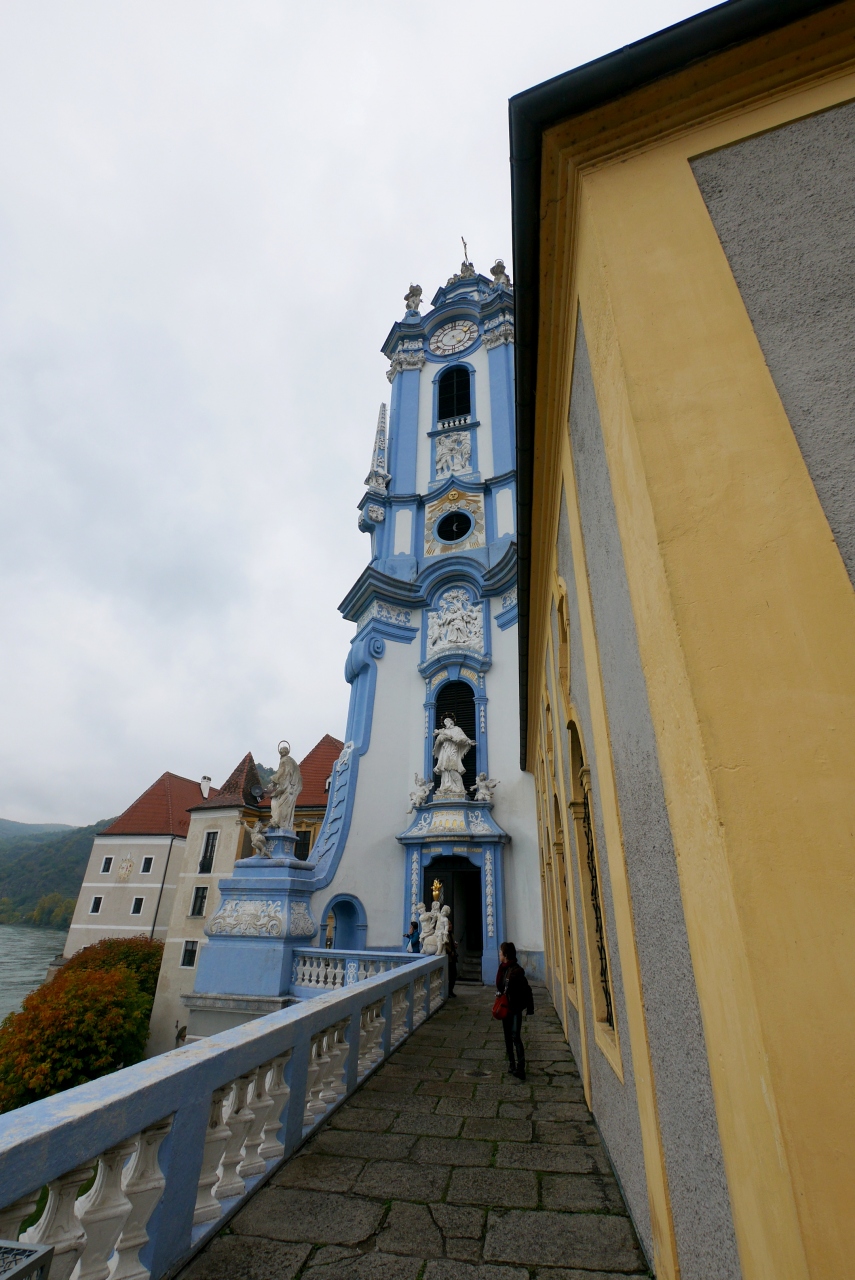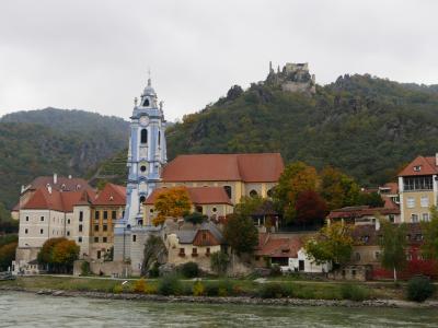 Durnsteinの真ん中に立つ大きな教会.水色の塔が目印.15世紀創建,18世紀にバロック建築に.聖堂の中は絢爛豪華 バルコニーからはドナウの流れが見える.真下に遊覧船の発着所 3ユーロと入場料が安く,見ごたえがある.展示室もあるがドイツ語のみの表記でわかりにくいが聖アウグスティヌスを中心としたキリスト教の歴史などを展示