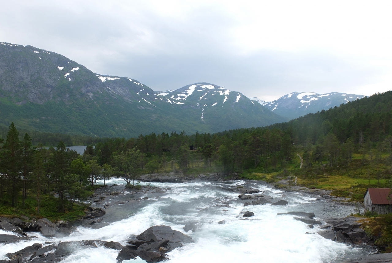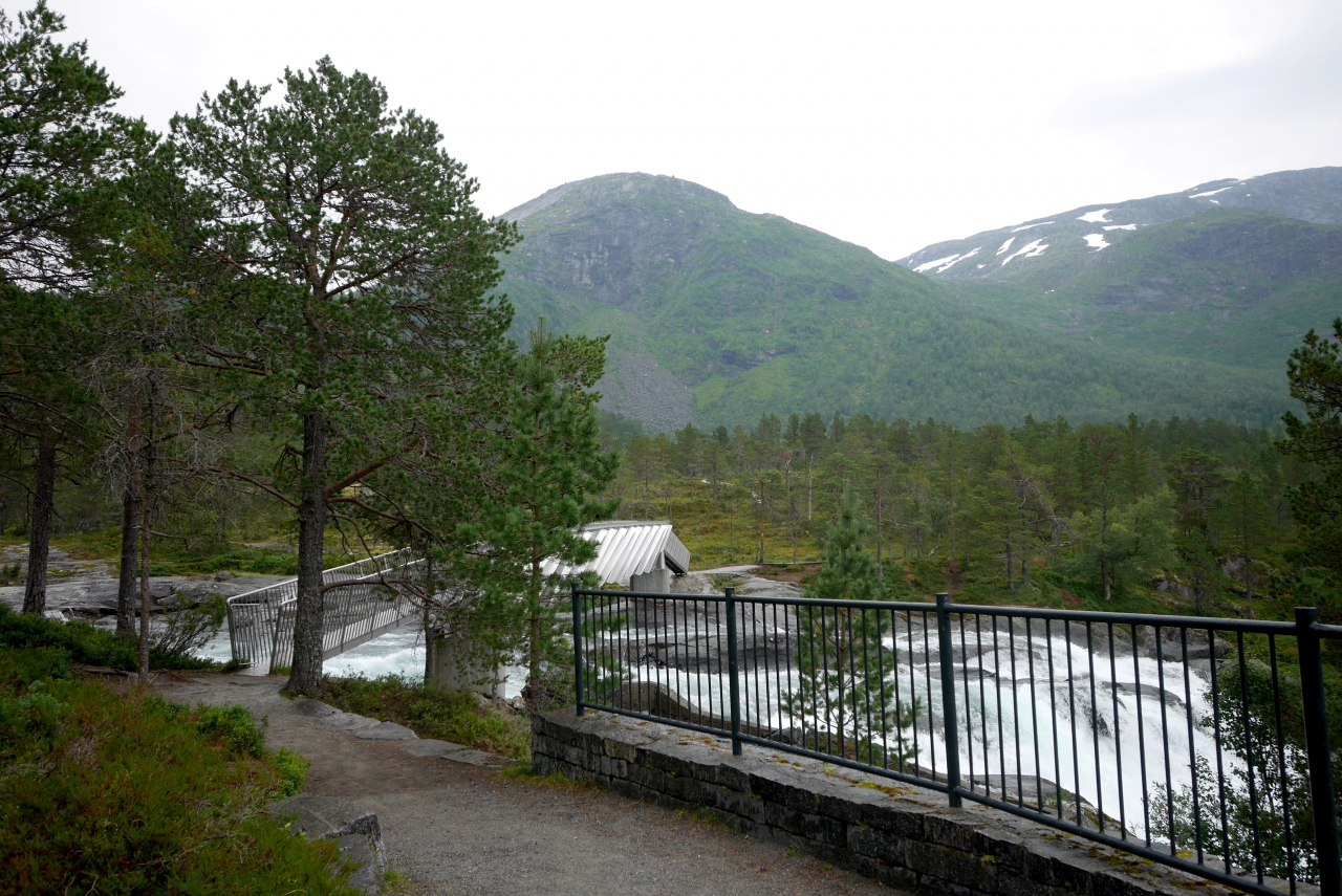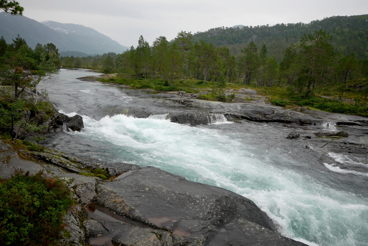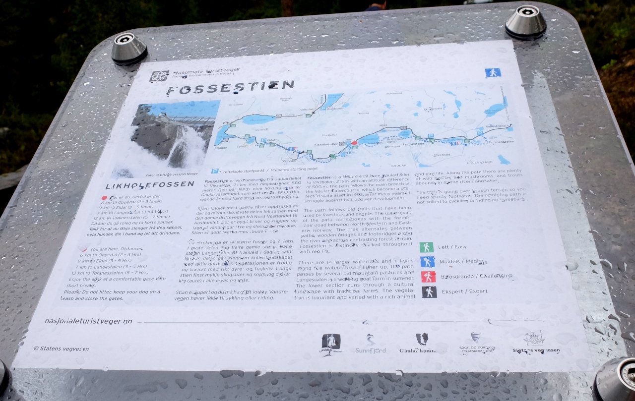 VangsnesからフェリーでDrasvikにわたってE39号線,Moskogまでは絶景が続く道だ.その途中にあるFossestienは急流を見ながらのハイキングコースになっている.私たちは滝を見ただけだがこのあたりをハイキングするのも楽しそうだ