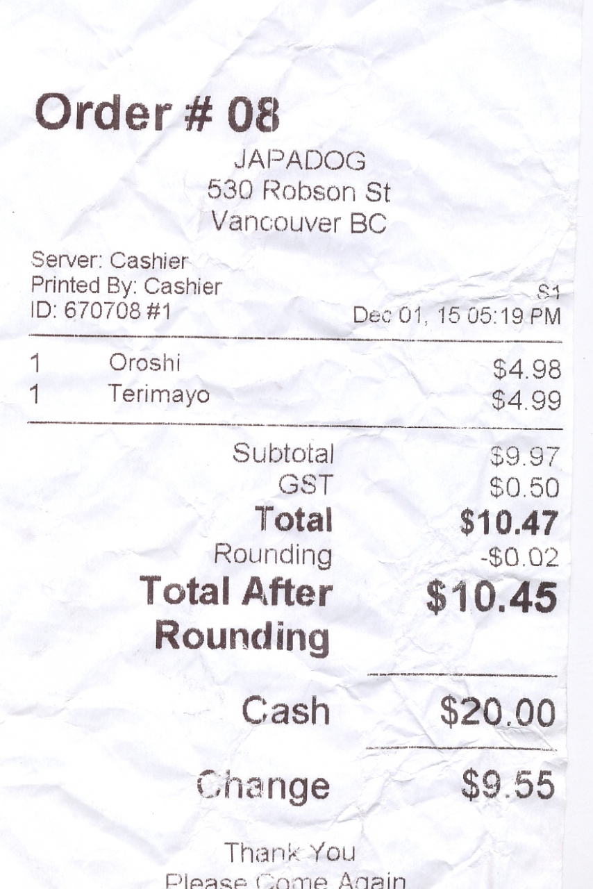 サットンプレイスホテルの前に屋台も出ているが,ロブソンストリートの店で買う.疲れていたので持ち帰って食べる.持ち帰るとき崩れてしまった.一つがOroshi4.98CAD もう一つがTerimayo 4.99CAD GSTなどが付き,2つで10.45CAD 1000円弱.