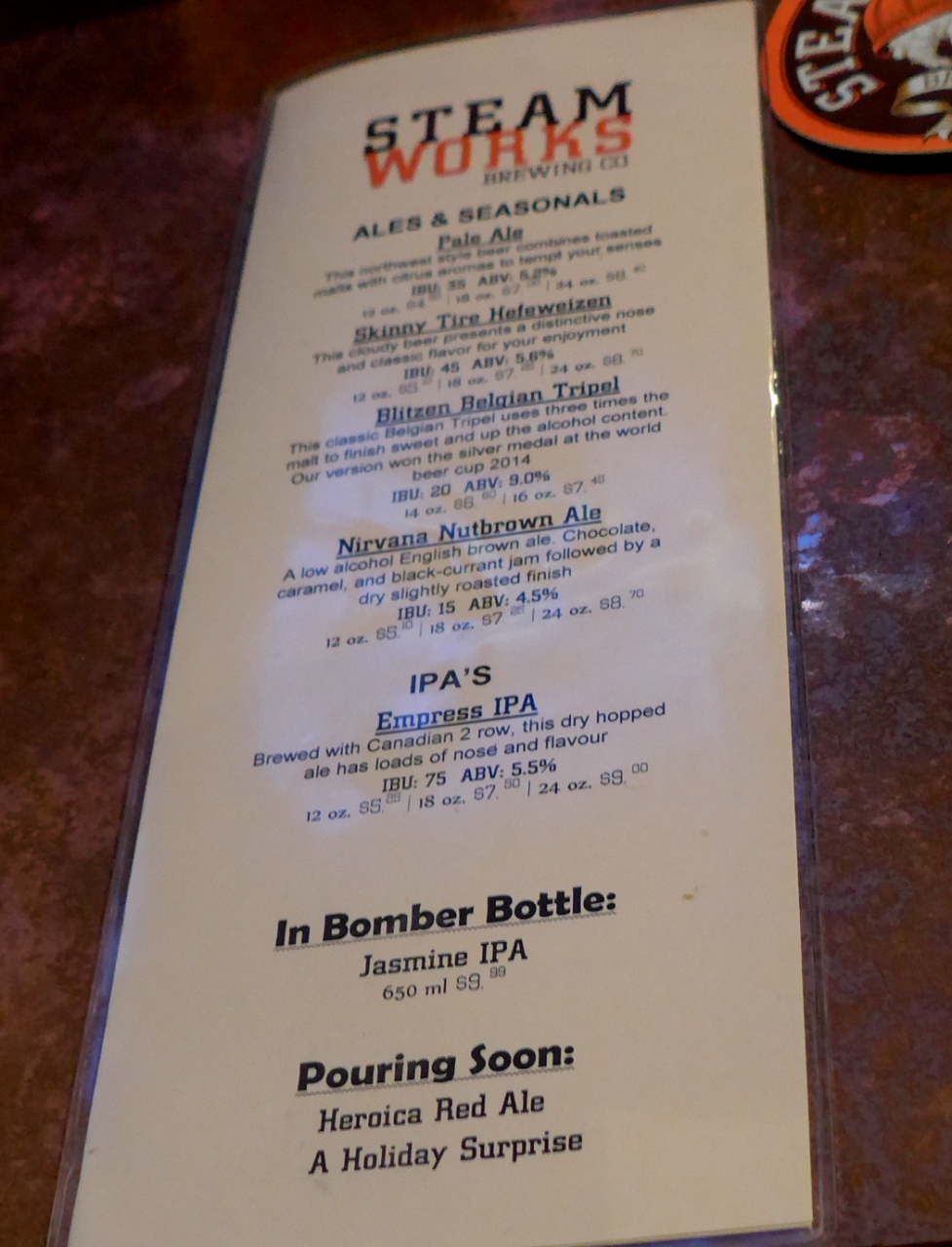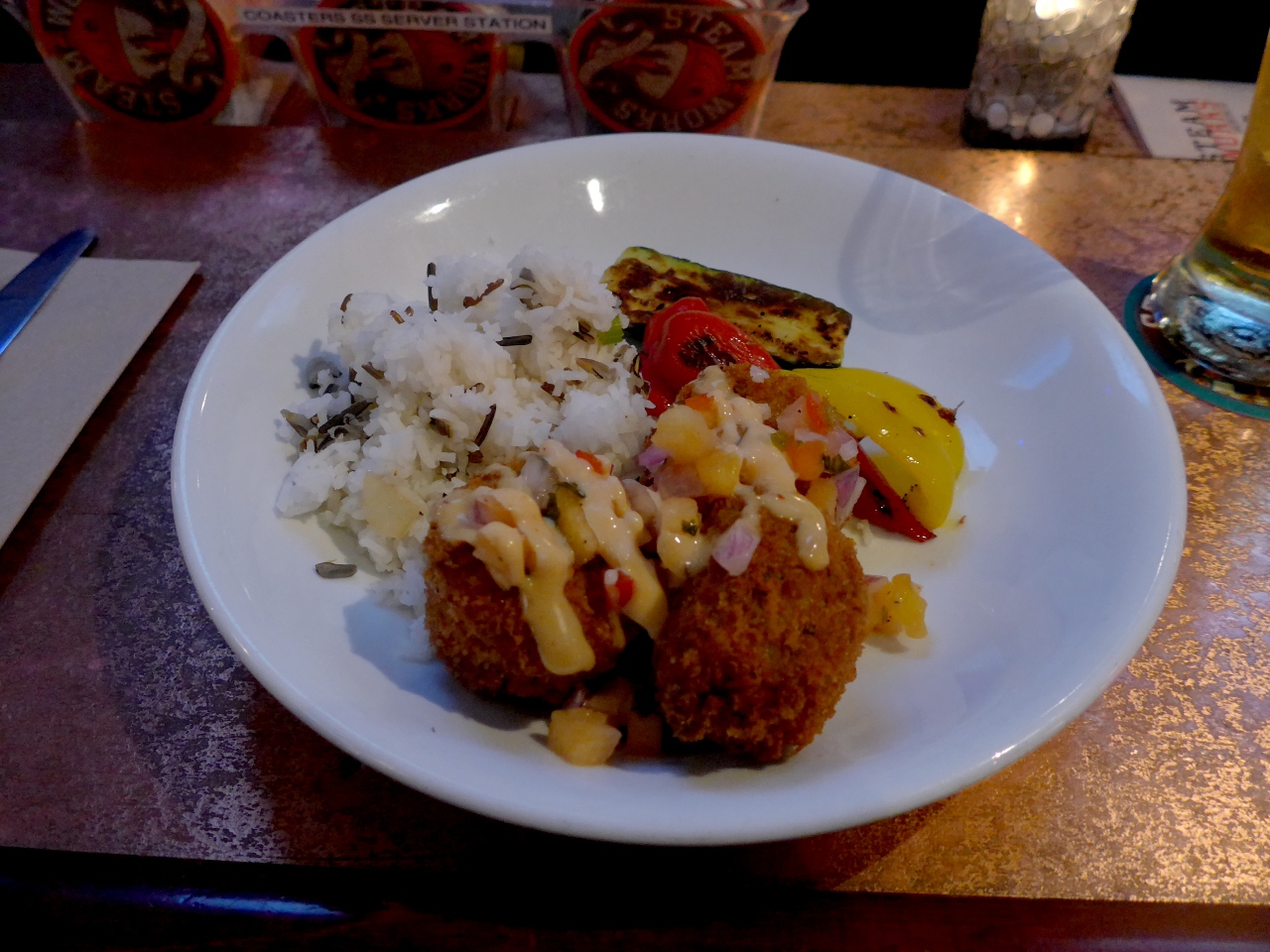 1/2 Pint Kolsh 4.75CAD Pilsner 7CADCrab Cakes 19.99 CAD 実はあまり体調がよくなく,これでおなか一杯.しめて34.51CADでめずらしく帰ることになる.普通に飲んで食べれば50-60CADだろう.クラブケーキはカニコロッケ風 ビールはとてもおいしかった.ピルスナーは飲みやすい.カジュアルな雰囲気でいやすいが,1745に帰る頃には満席でお客を断っていた.いくなら17時前のが無難そうだ.入ってもいい店.蒸気時計やウオーターフロント駅のそばで便利