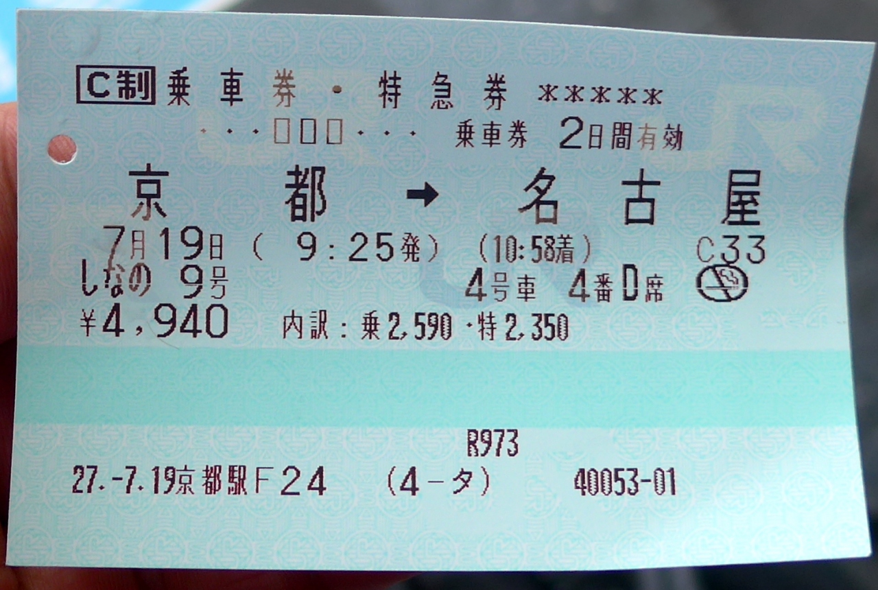 在来線で名古屋に向かう.0925に特急しなの9号がある.これで名古屋まで行ってみよう.在来線では2013年に名古屋-彦根間,2014年に京都-大津間は乗車しているが,大津-彦根はどのくらいぶりだろうか...しかし自動販売機で指定券購入できず,みどりの窓口の長蛇の列に並ぶ.グリーン車がパノラマカーなので後でグリーン車にしなかったことを後悔した.帰りは新幹線 のぞみ13号で京都へ帰る.なんと自由席特急券が特定特急券で5070円,来た時のしなのの指定席が4940円,新幹線が自由席であっても130円しか高くない.これじゃあ誰もしなのの名古屋大阪間には乗らないよね.久しぶりの東海道在来線の景色が楽しかったが,これでは乗るなということだよね.